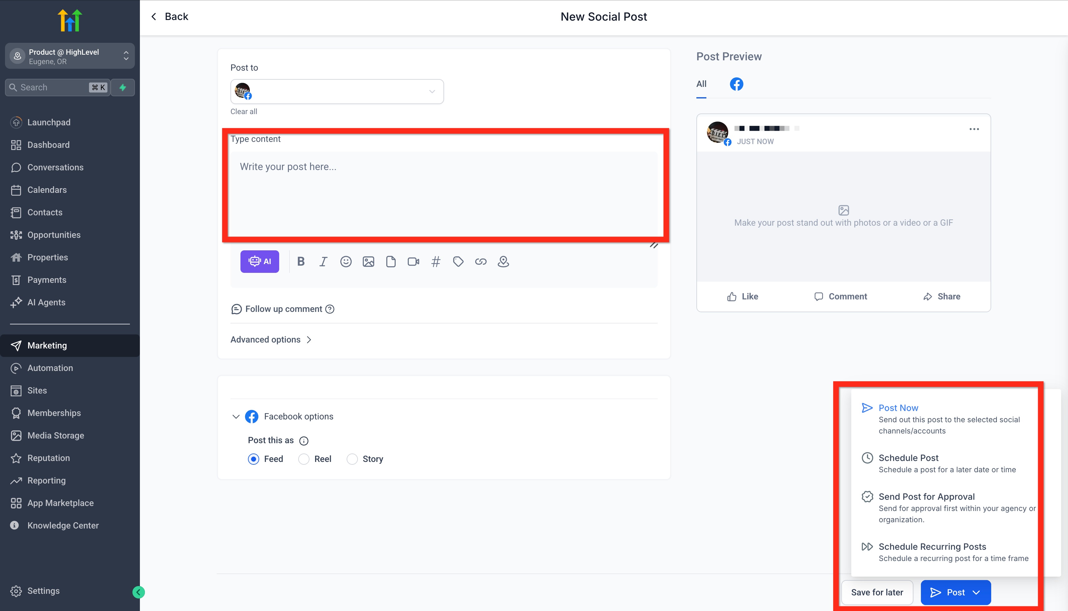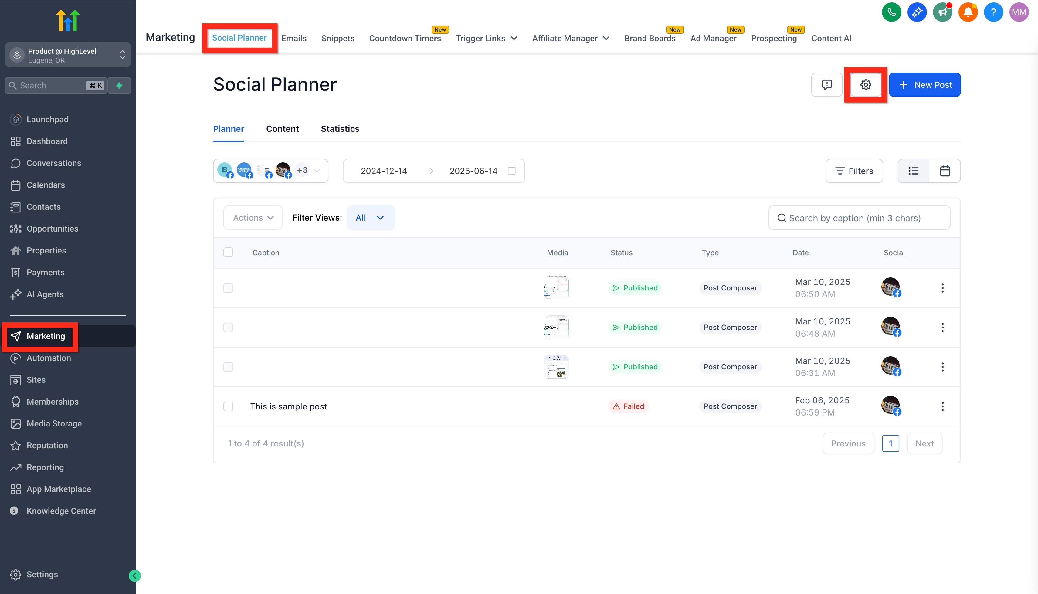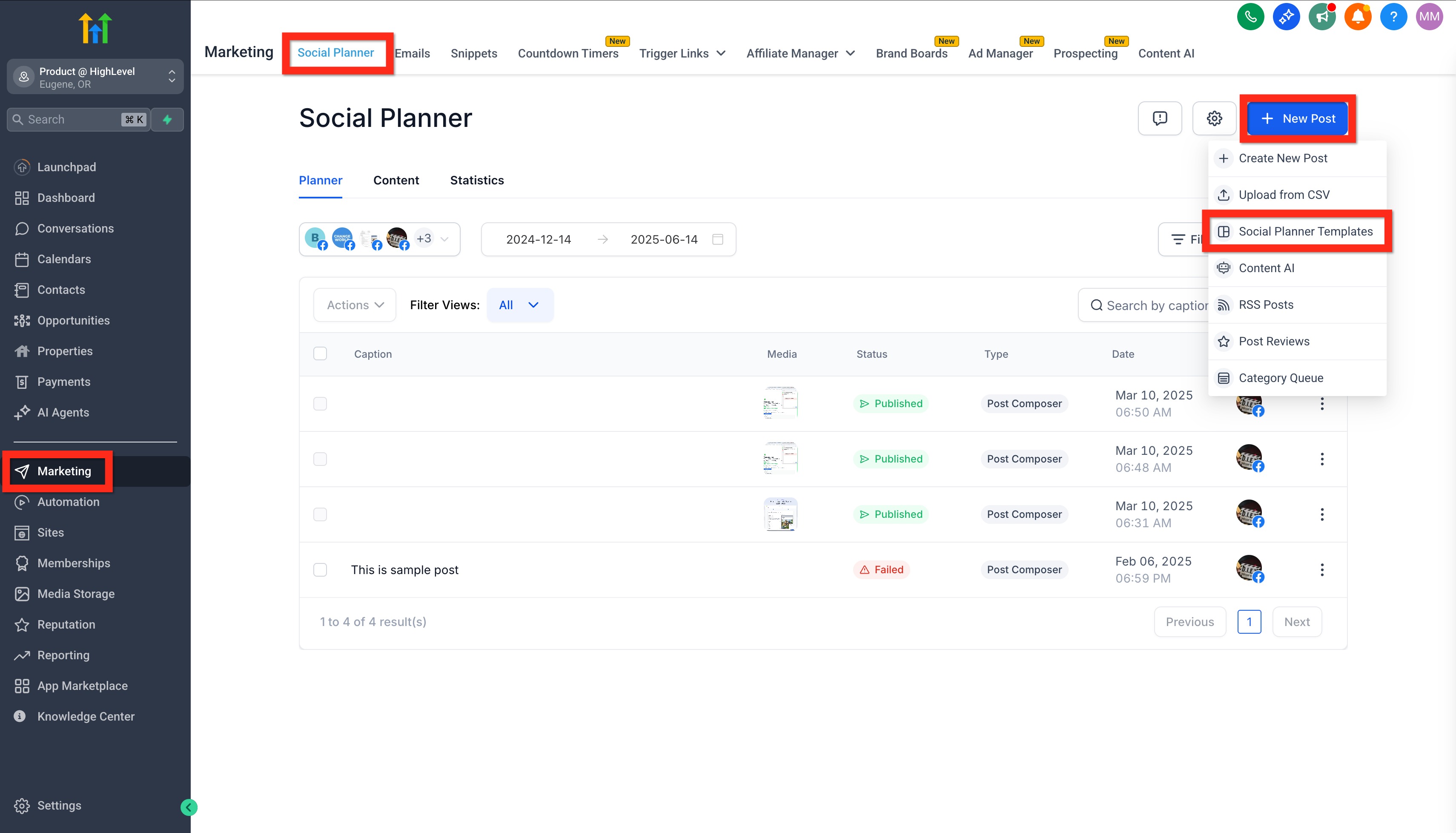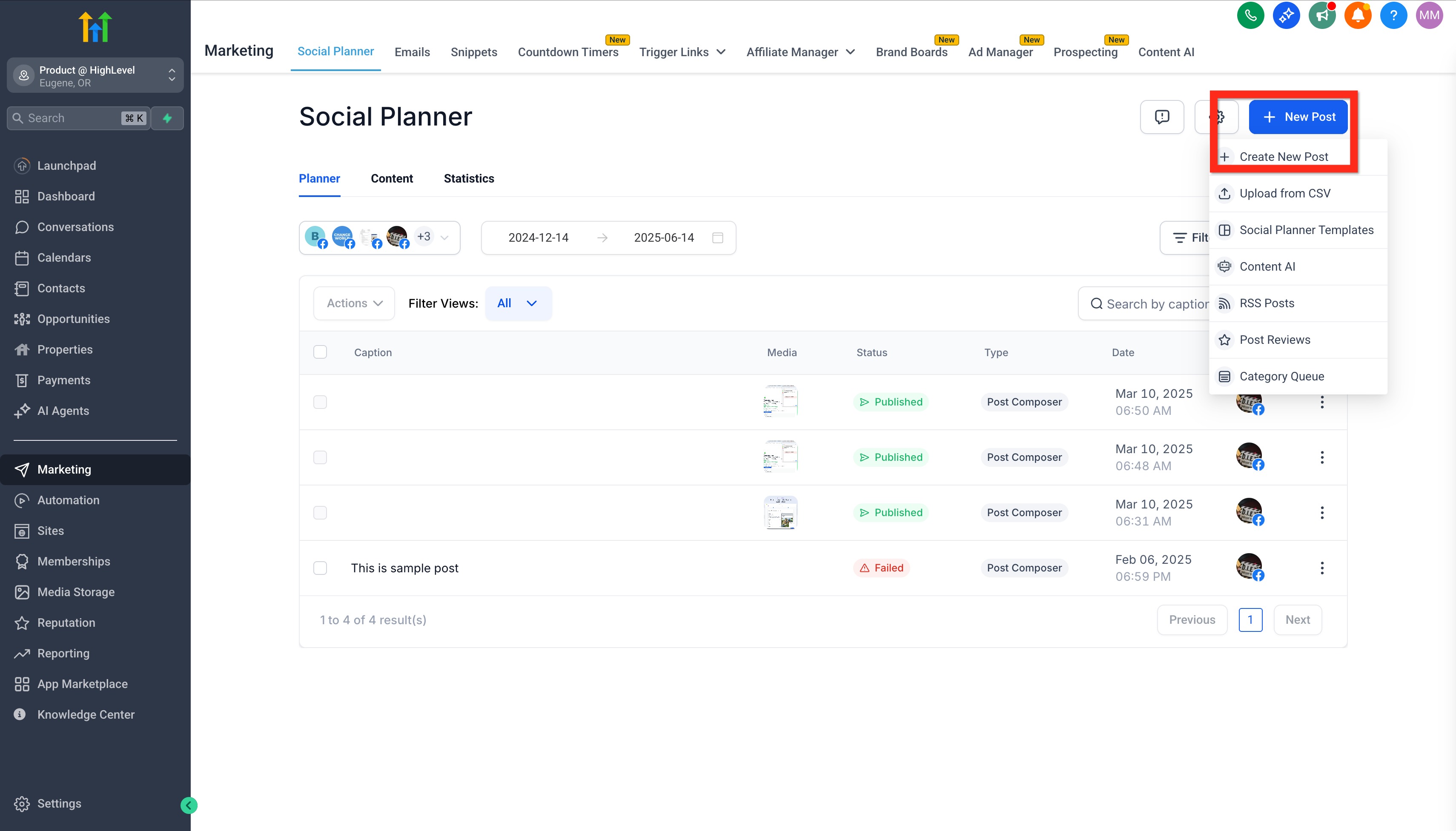 - In Marketing > Social Planner, click New Post > Create New Post.