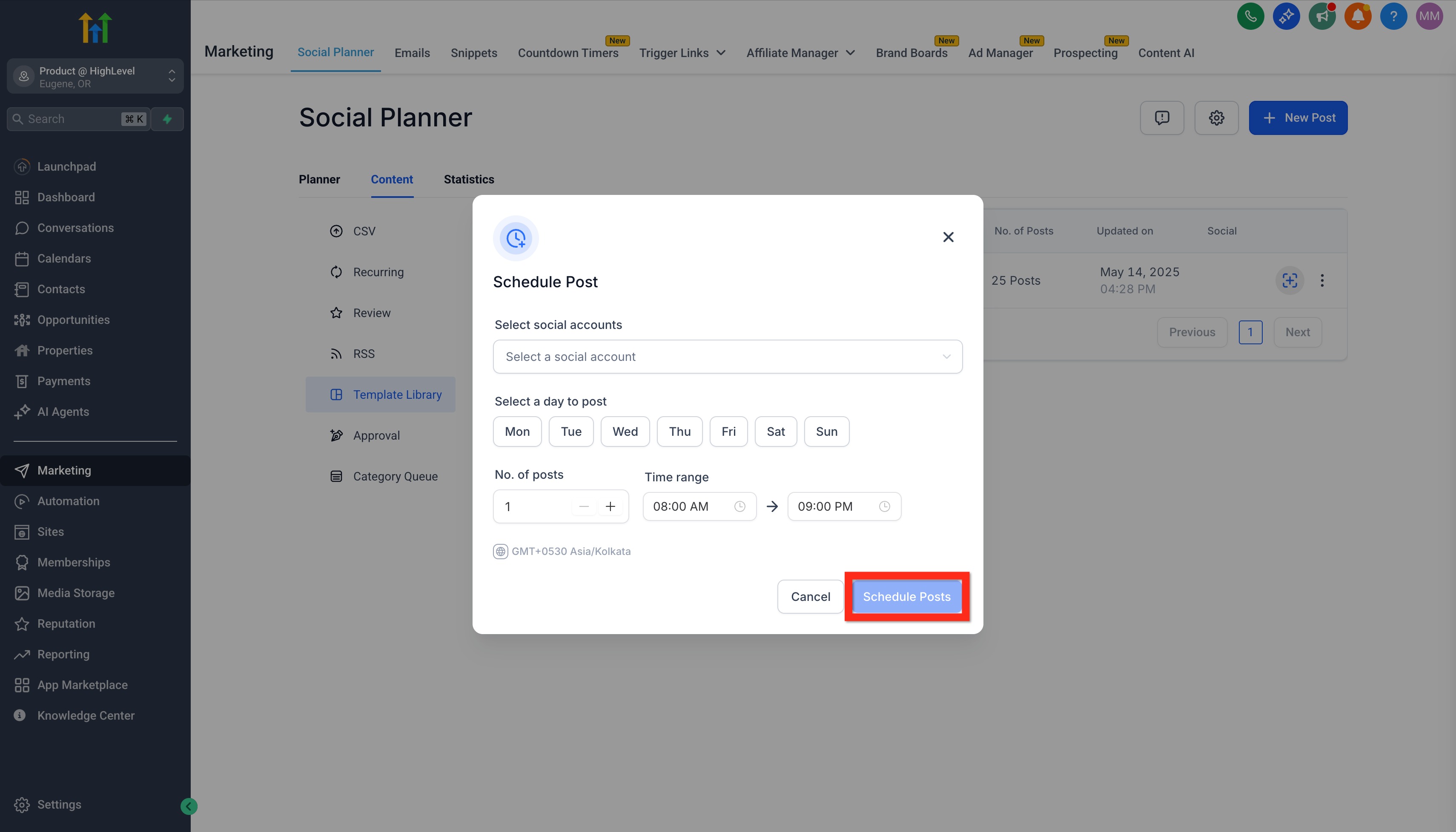 - Fill out the necessary details in the Schedule Post modal, including your Facebook account and timing.
