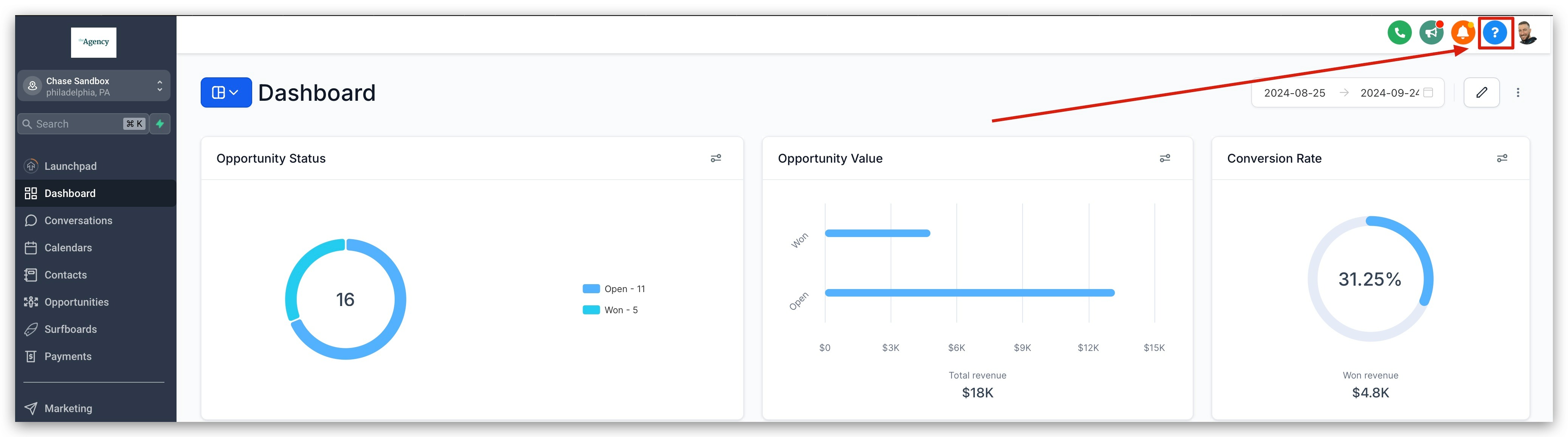 At any time of the day or night, seven days a week, you can begin a new LIVE chat with one of our HighLevel Support Agents! To access your support options, select the blue question mark in the top right corner of the HighLevel Application (Available on Desktop only). From here, you can choose the support option that best fits your schedule or needs.