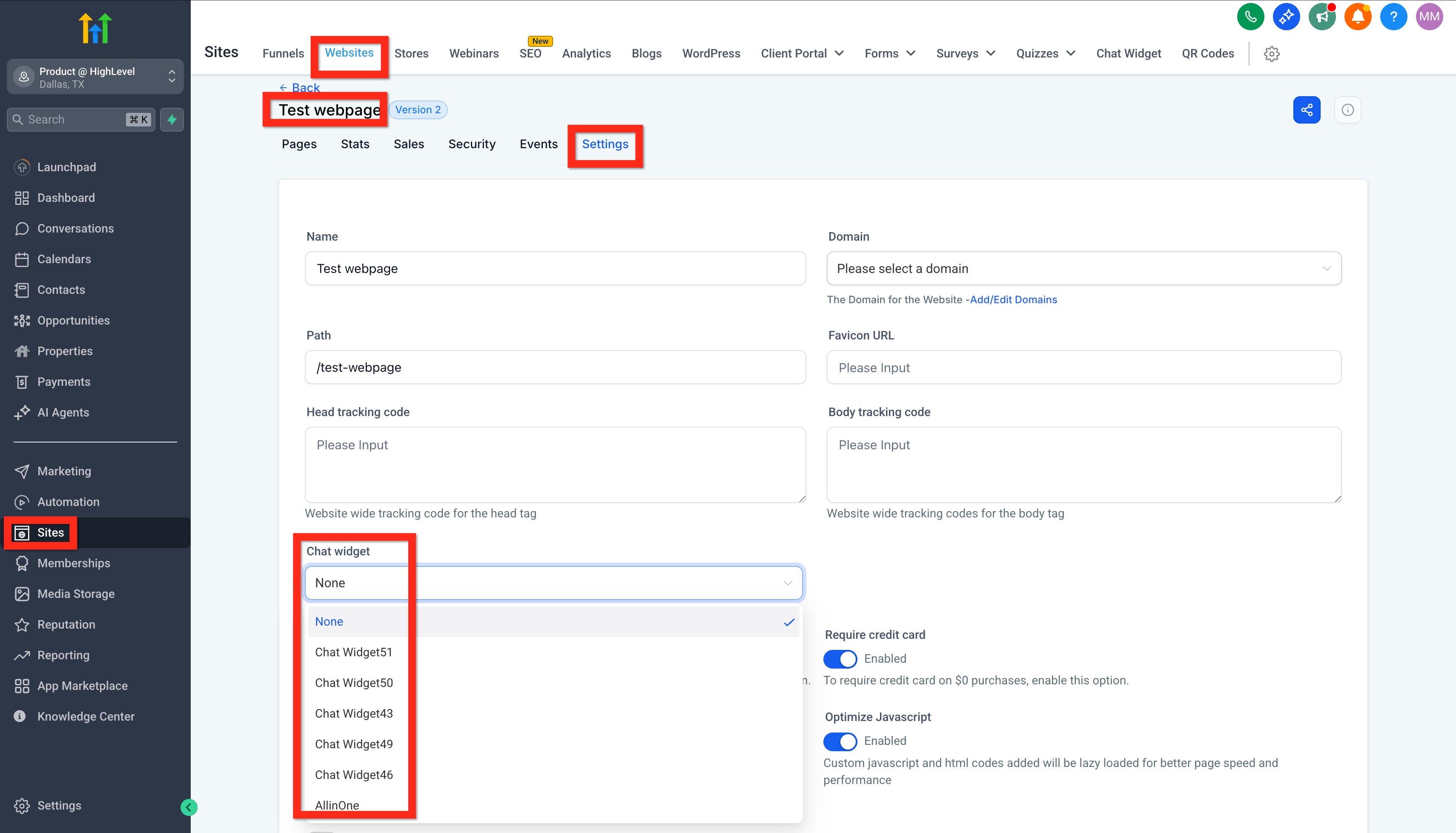 - Navigate to Sites > Websites OR Sites > Funnels