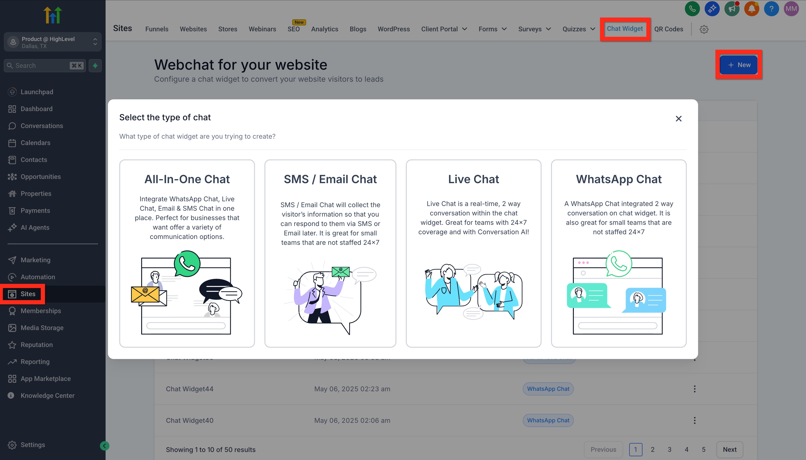 - Click New where you can choose one of the following: All-in-one chat, SMS / Email chat, Live chat, WhatsApp.