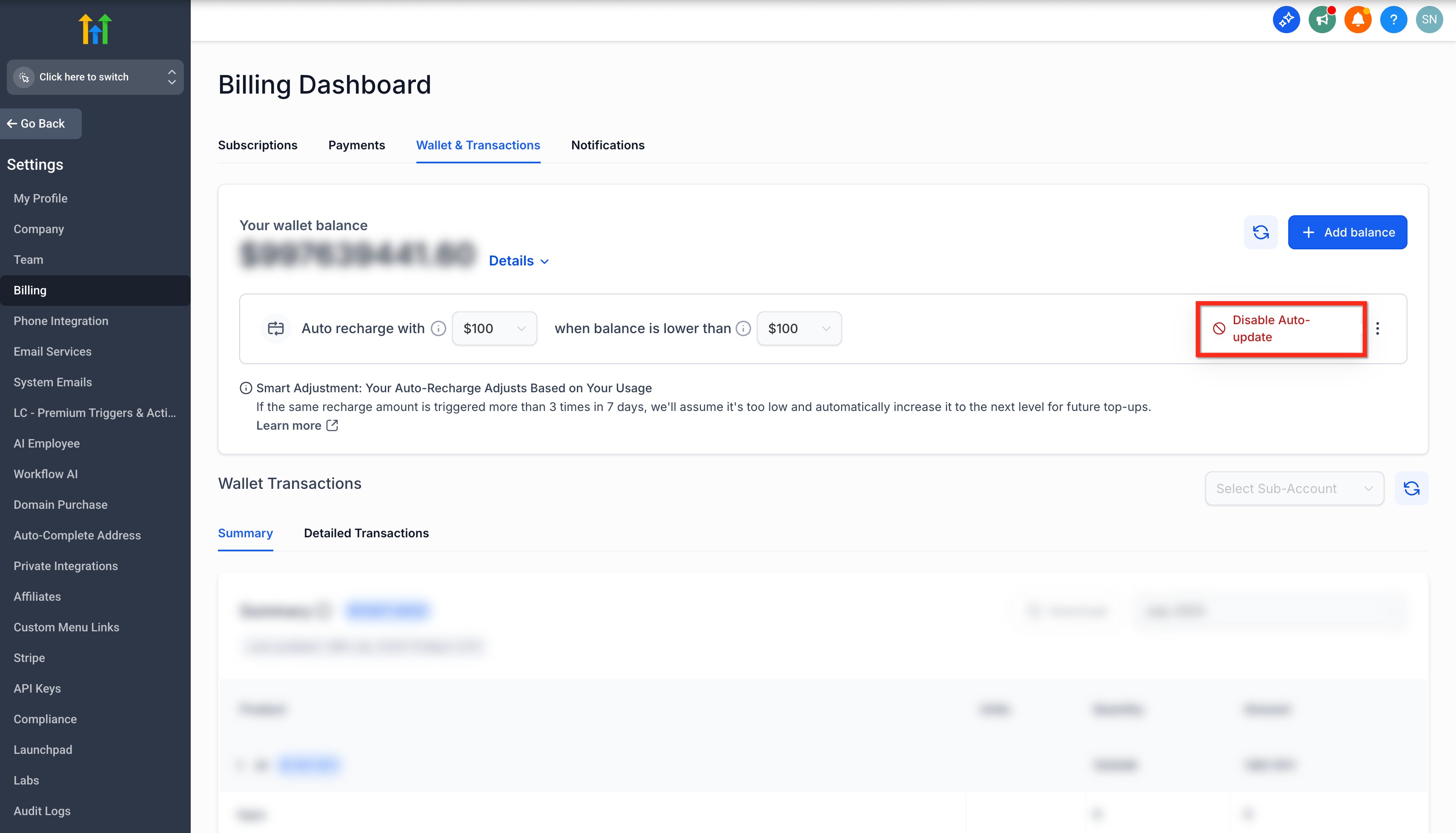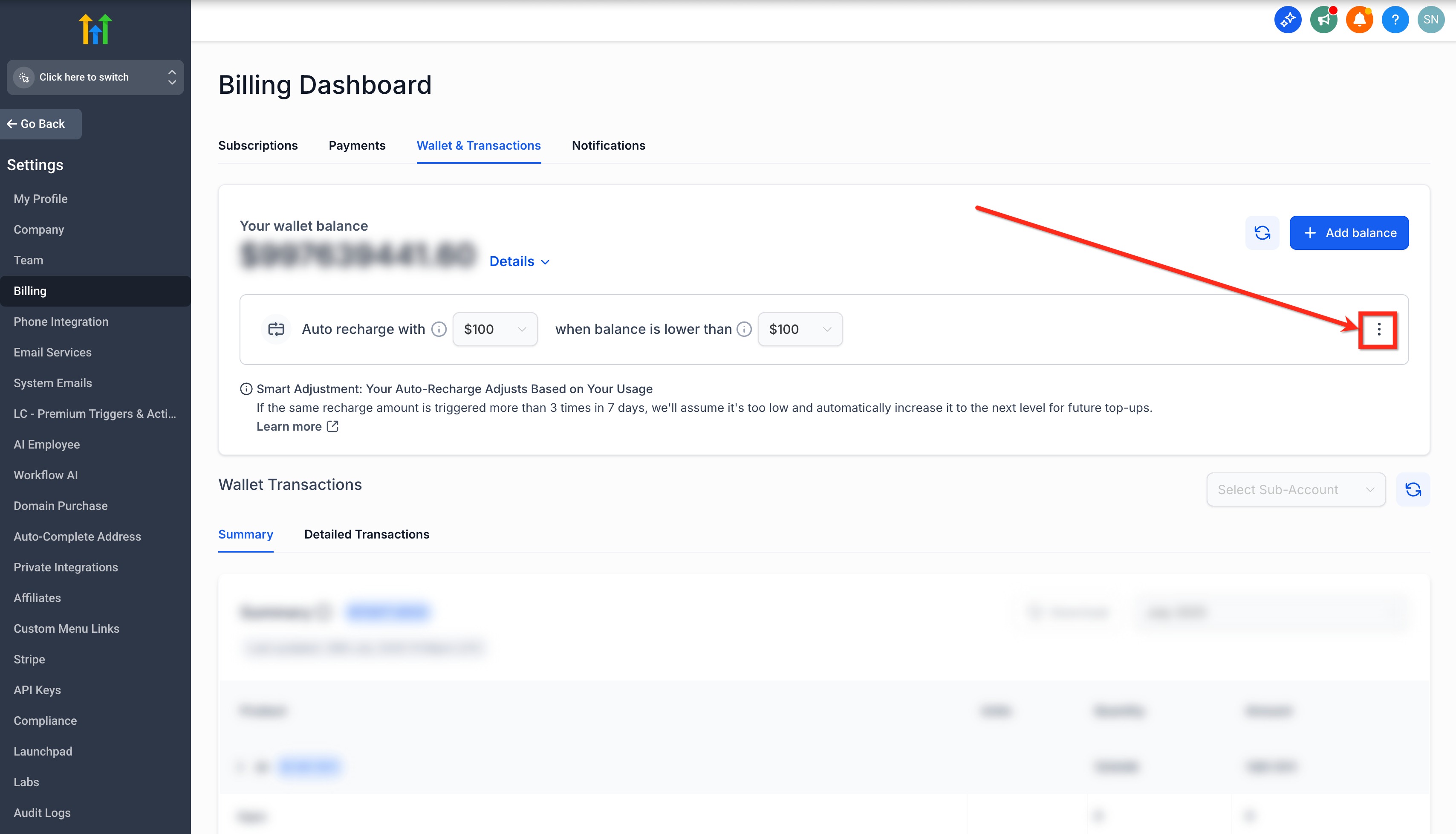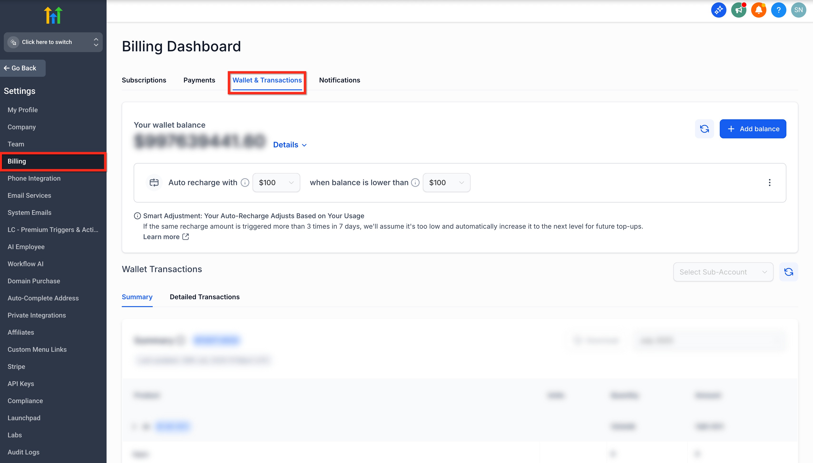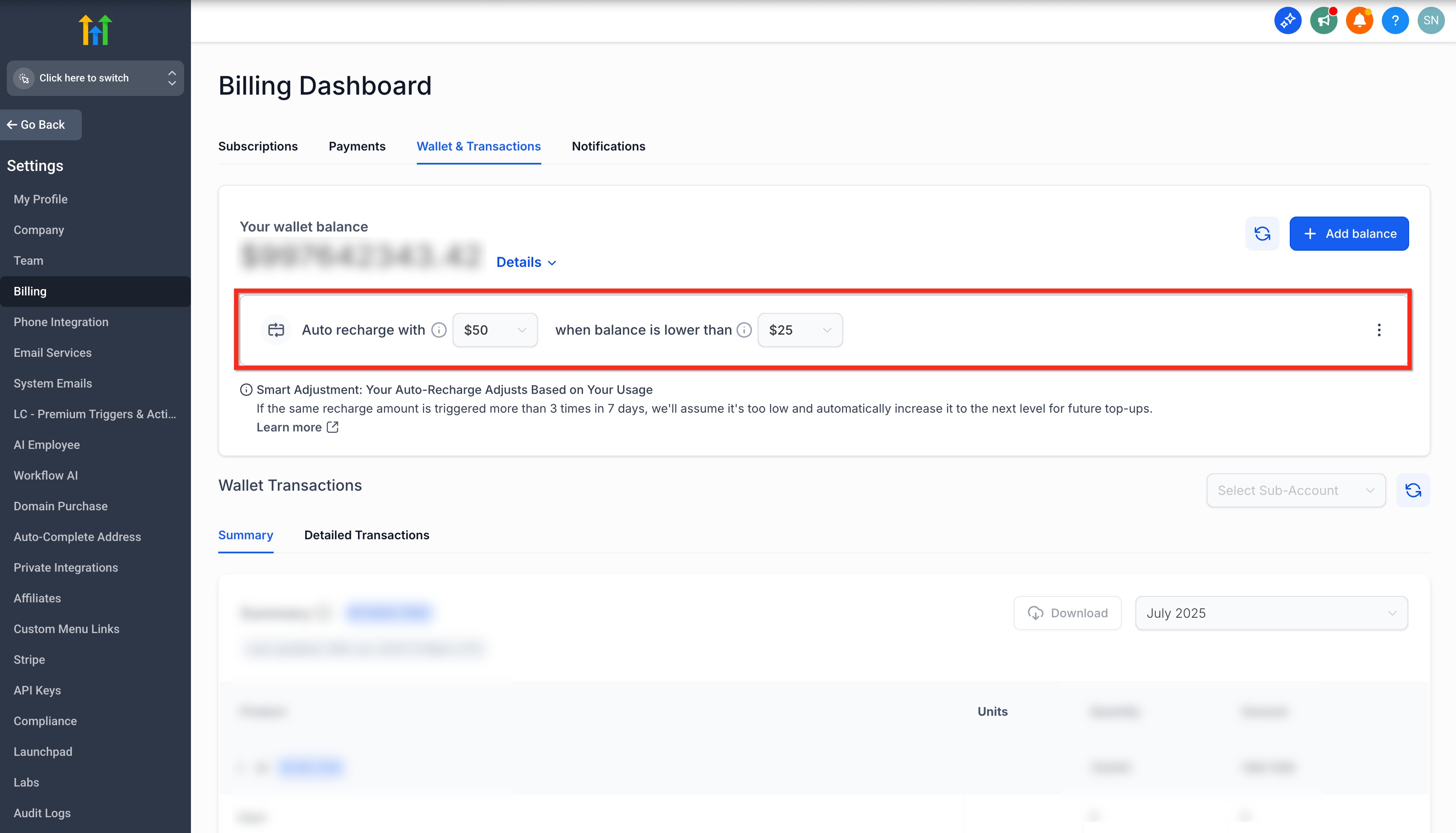 Keeping your HighLevel wallet funded ensures uninterrupted SMS, email, and phone usage for you and your clients. Auto Recharge automatically tops up your wallet balance when it dips below a threshold, while Smart Adjustment intelligently increases that top‑up amount when your usage grows. This guide explains both features, why they matter, and how to fine‑tune or disable them to maintain cost control.