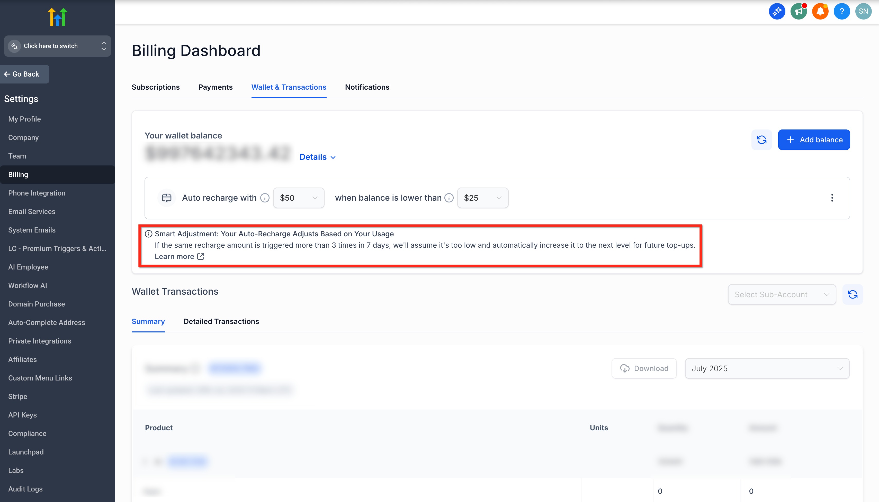 Smart Adjustment monitors how often Auto Recharge fires. When the same recharge amount triggers more than three times within any seven‑day window, HighLevel moves you to the next preset tier (e.g., from $200 → $500).