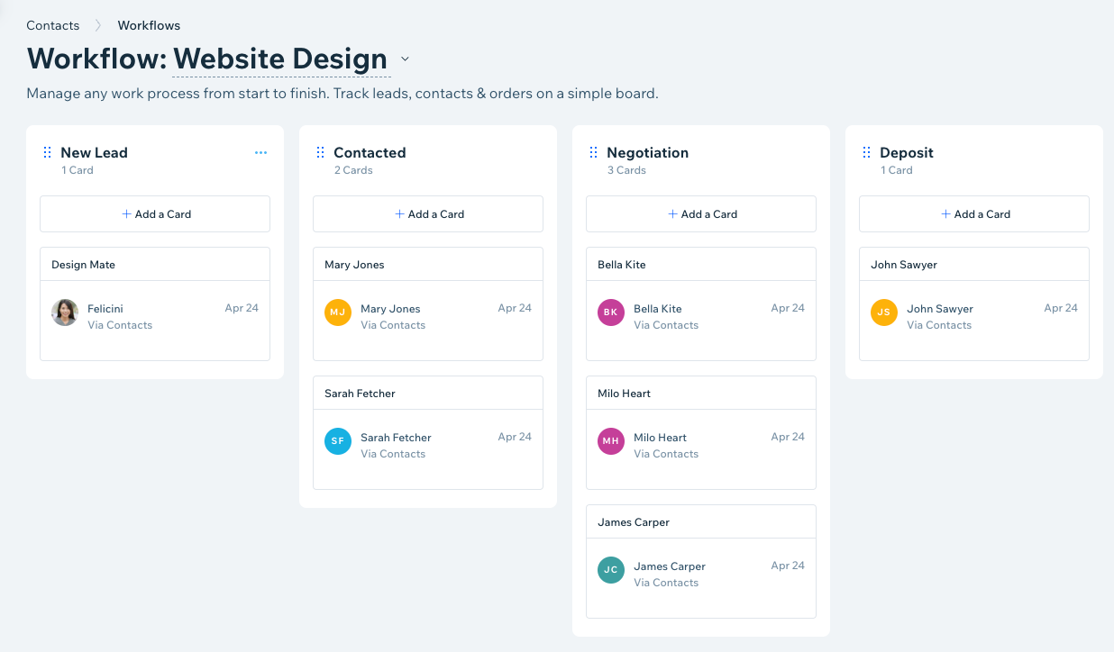 A Wix Workflow is a board that displays all of the steps of a project so you can easily keep track of contact cards in every column. Wix workflows cannot be exported and must be recreated in Kontactly Pipelines & Opportunities.