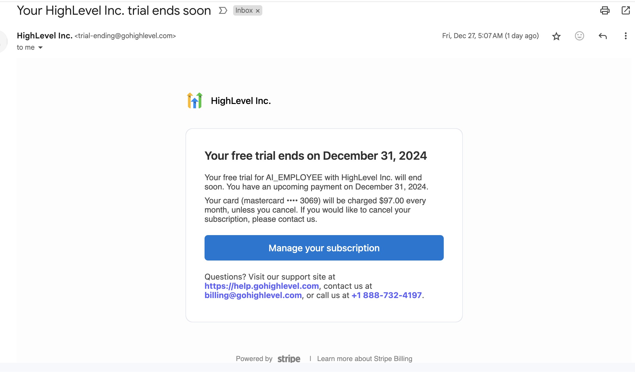 - HighLevel charges you $485 (5 x $97).