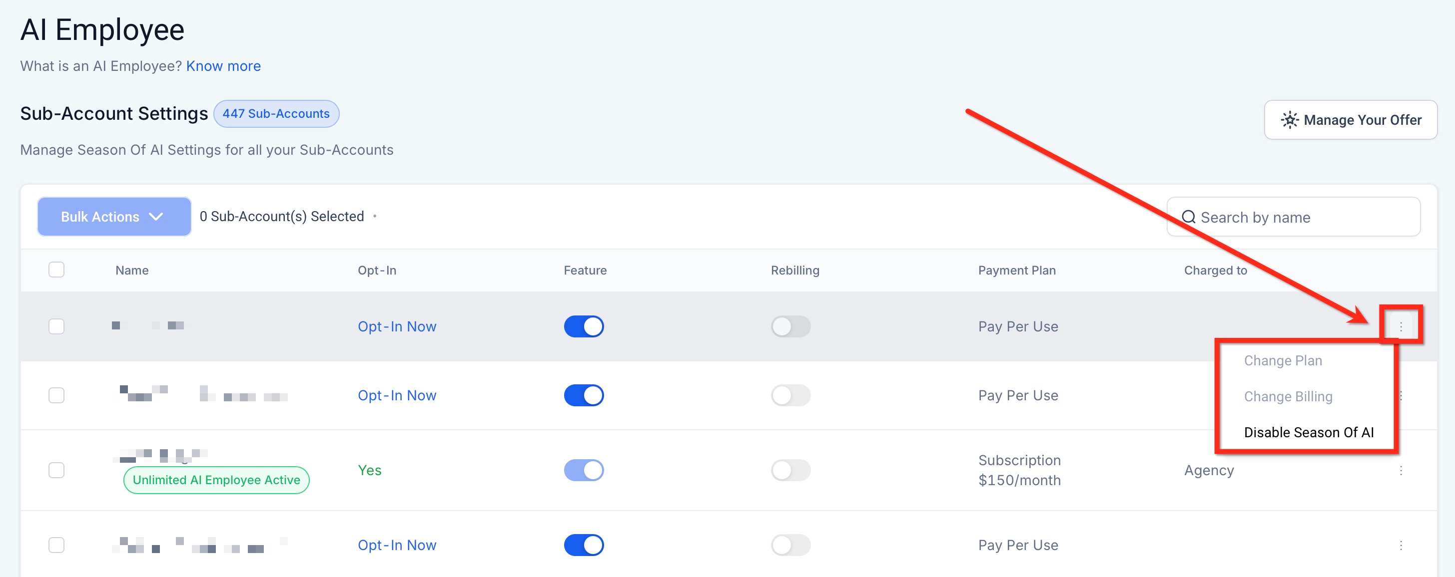 You can disable AI services for individual sub-accounts through the settings menu in the AI Employee settings dashboard.