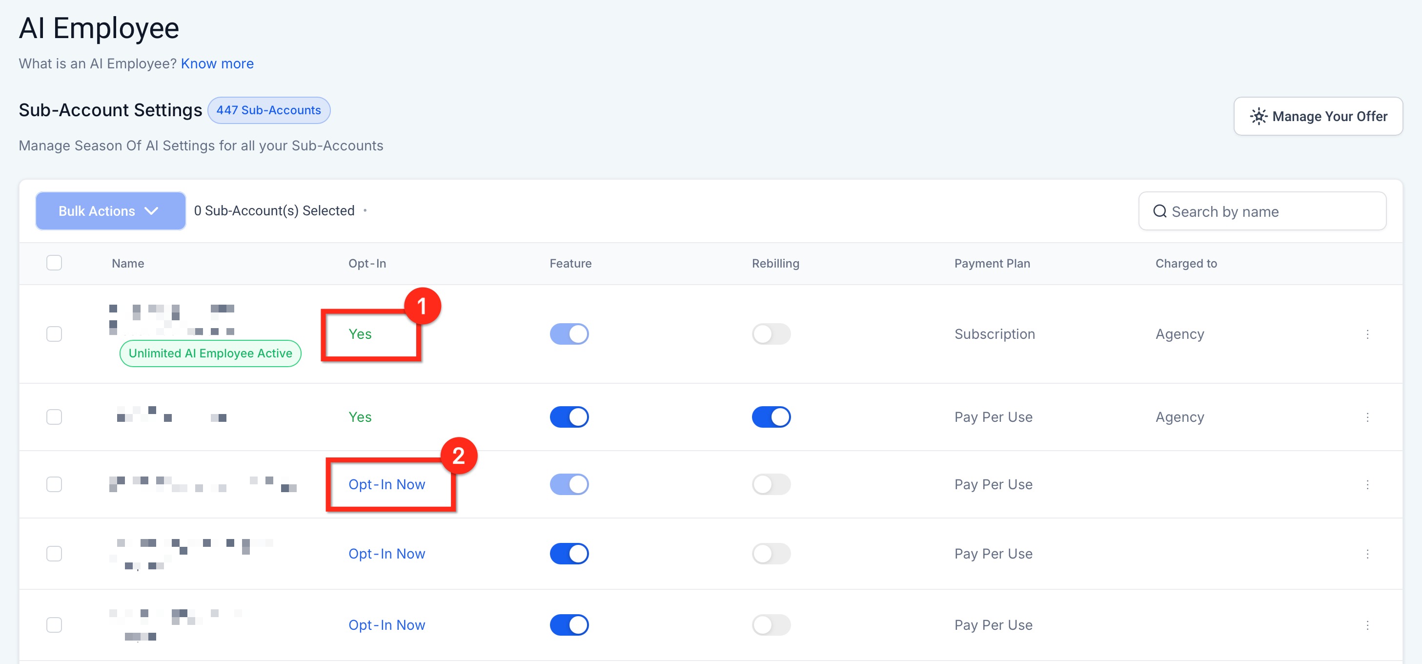 If YES (Sub-account DID Opt-In): Sub-accounts that opted into the Season of AI promotion will continue using AI services based on the selected plan.