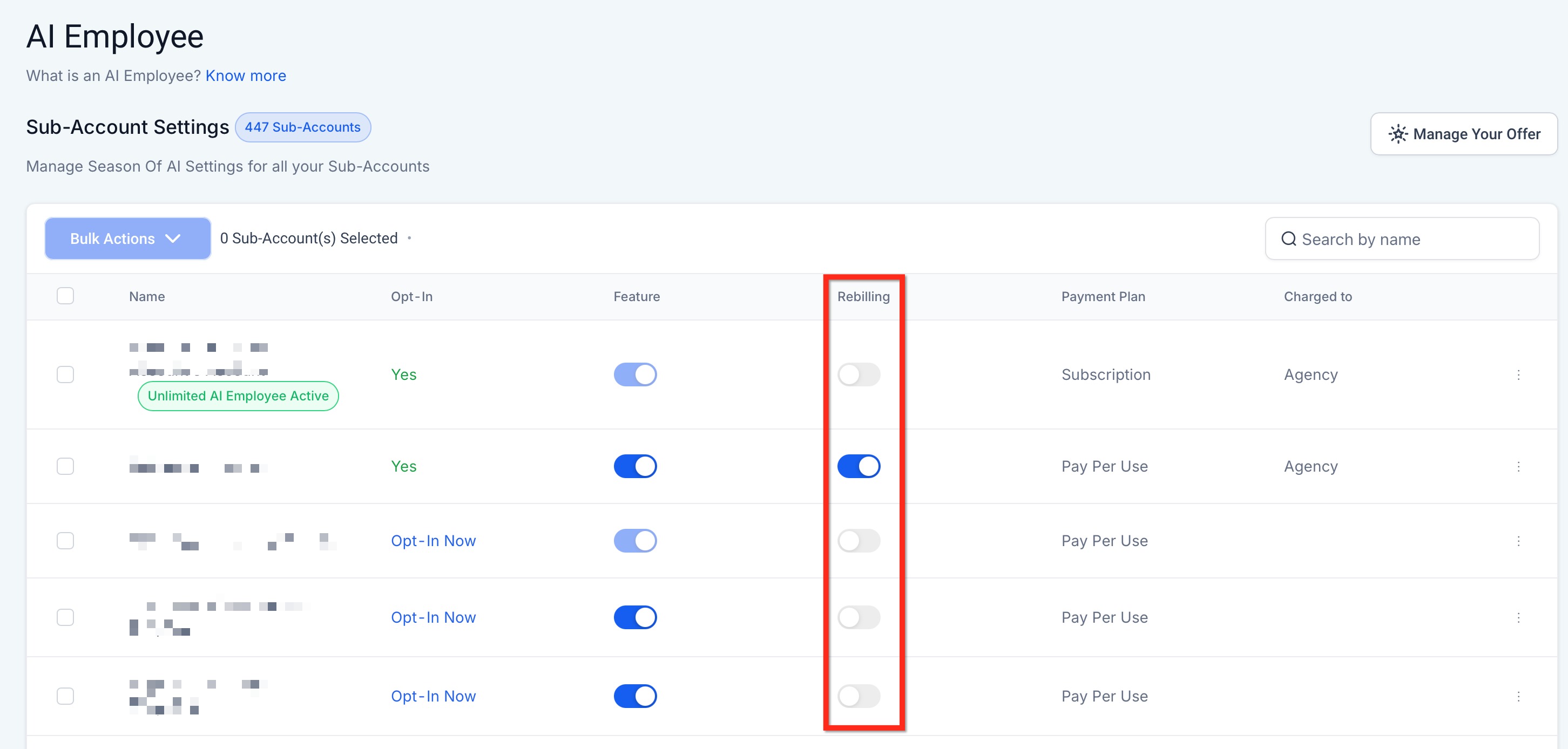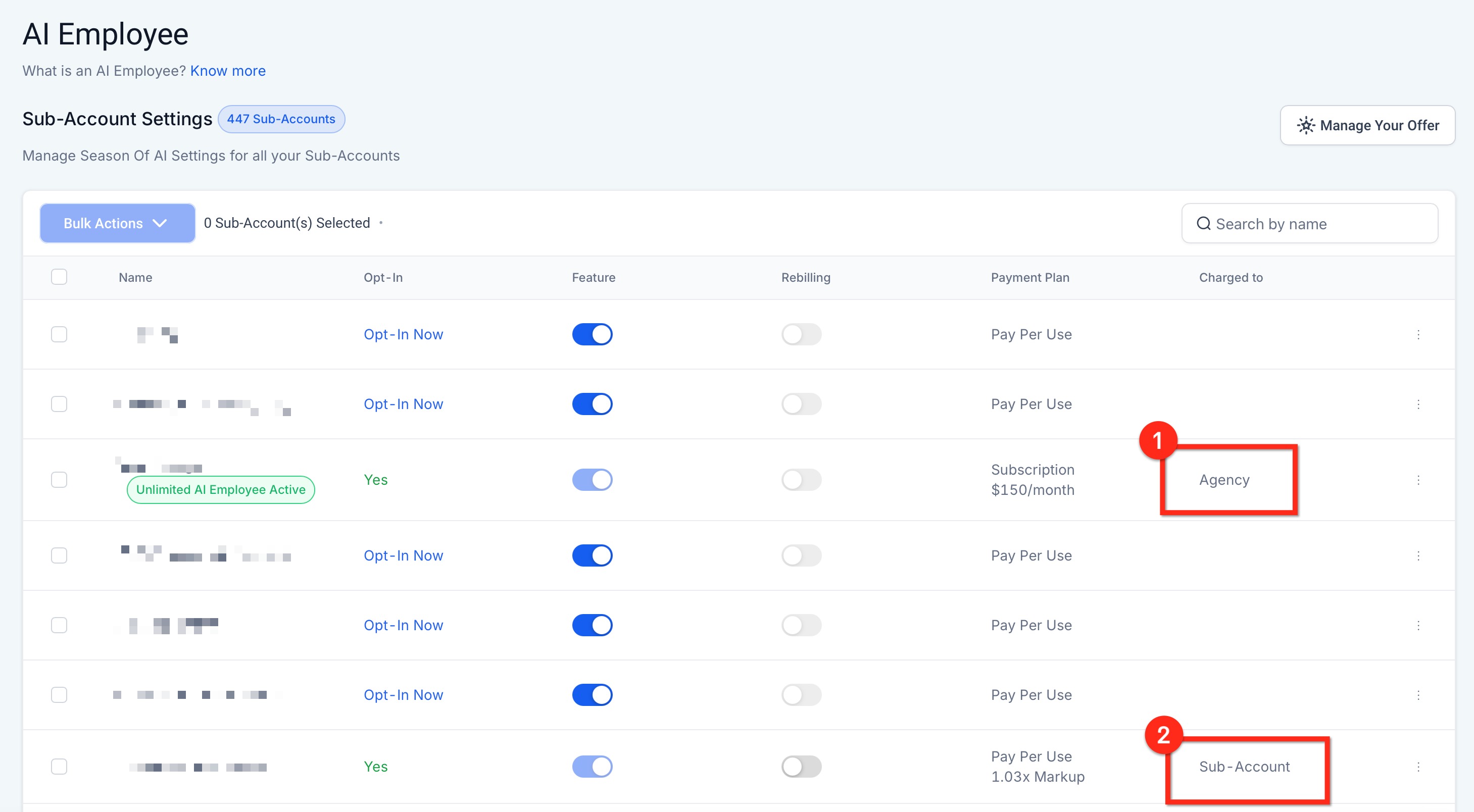 IMPORTANT: Agencies will ONLY be charged by HighLevel for sub-accounts that have opted into the Season of AI promotion and selected the Unlimited Plan. This means that if you are rebilling your customers for AI features, you will turn a profit after HighLevel charges your agency. AI Employee refers to the collection of AI Services within HighLevel. Voice AI, Conversation AI, Reviews AI, Content AI and Funnel AI.
