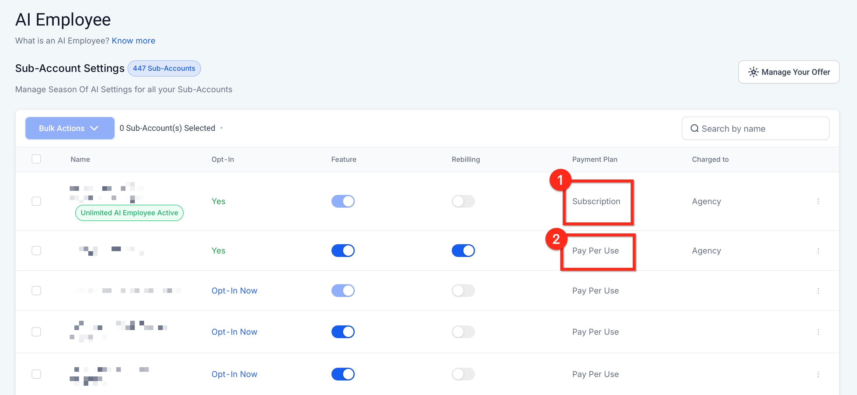 Pay-Per-Use Plan: Agencies are charged based on sub-account usage. If rebilling is enabled, sub-accounts pay for their usage directly; otherwise, the agency covers these costs.