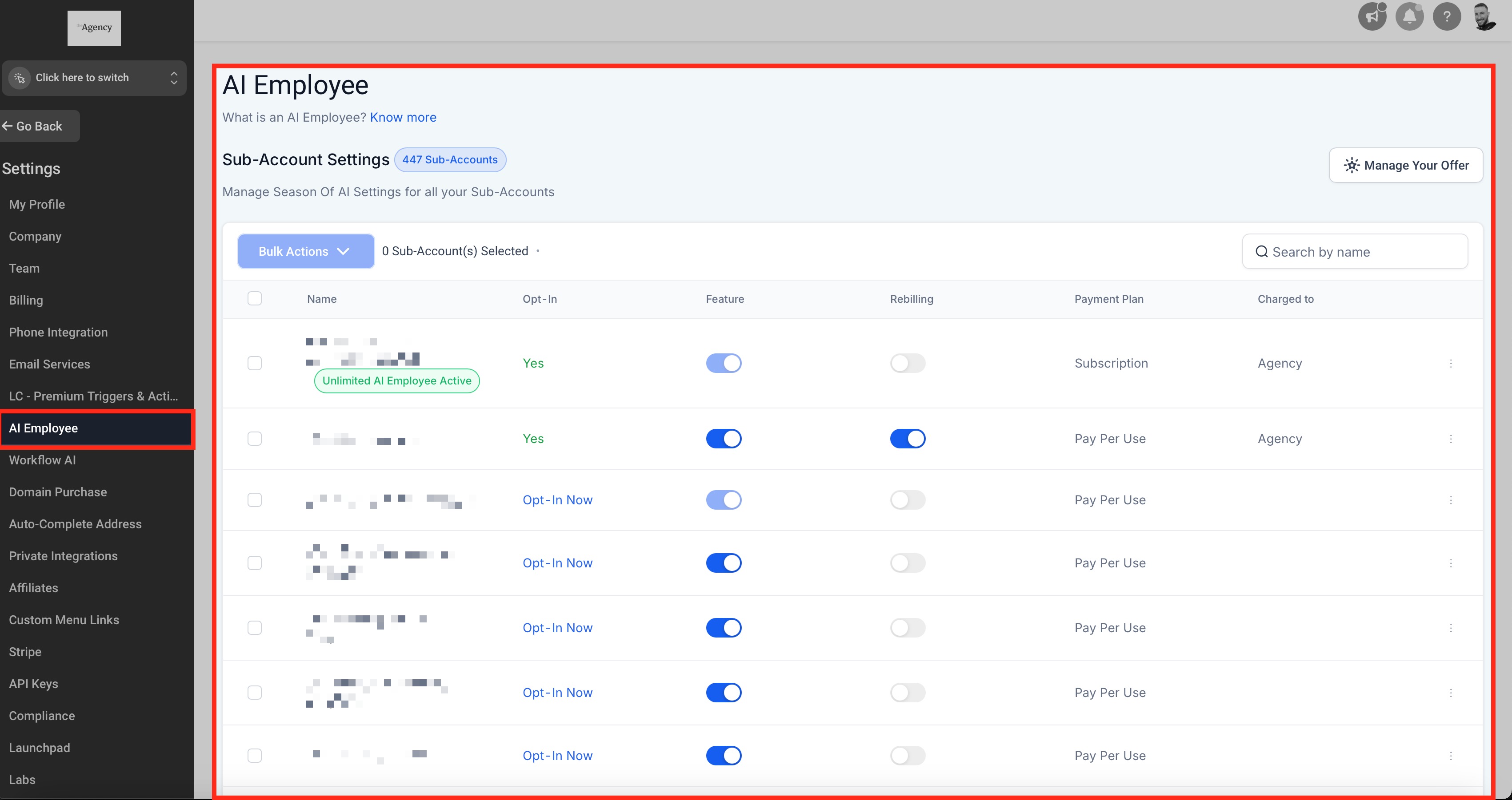 Navigate to AGENCY VIEW > SETTINGS > EMPLOYEE AI and review the sub-account’s opt-in status under the AI Employee settings dashboard.