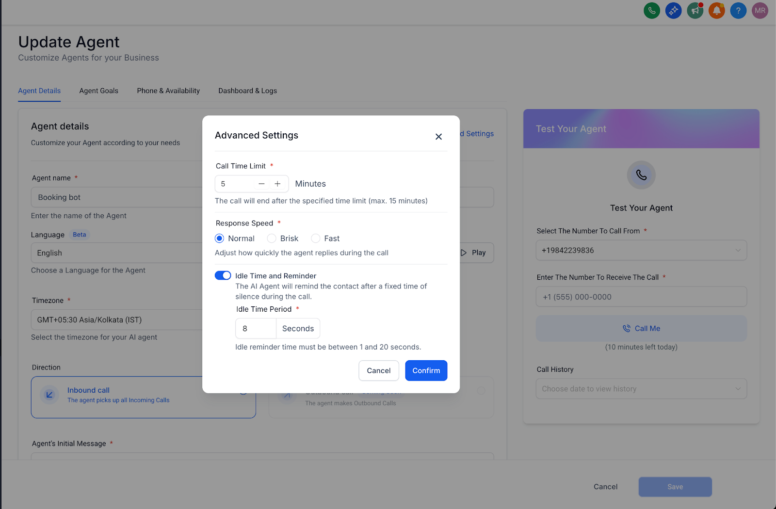 We’ve added the Idle Reminder Timer in every agent’s Advanced Settings, letting you configure how long (1–20 sec, default 8 sec) the agent waits before issuing a natural re-engagement prompt.
