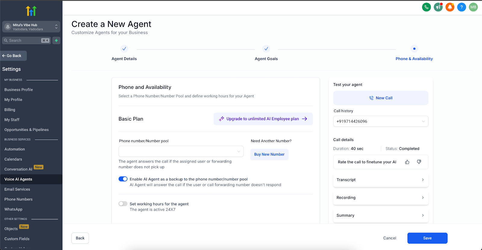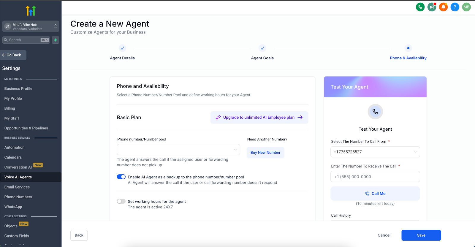We’ve made it even easier to validate your AI Agent before going live. Now you can test your AI Agent directly in the final step of the Create Agent flow. No need to navigate away — just enter your number, receive a call, and experience your agent in action instantly.