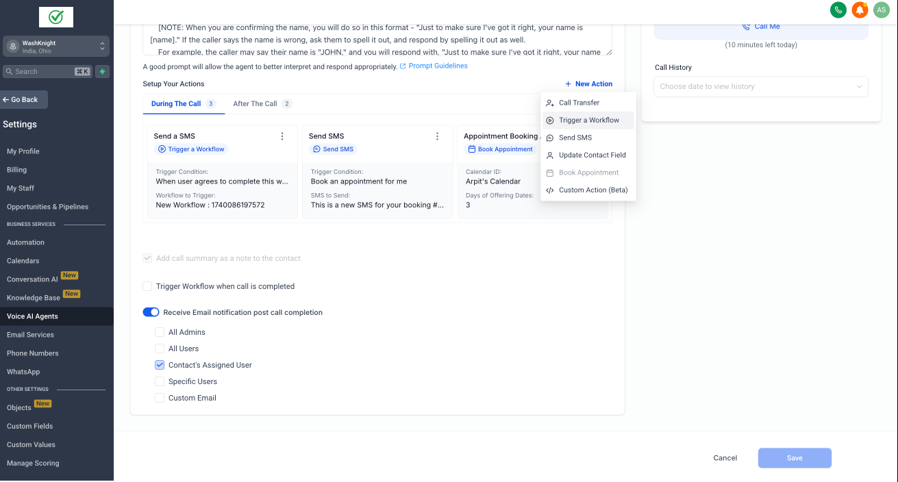 The actions are now split into During the Call and After the Call sections. Each tab displays the total number of actions configured.Streamlined Creation Flow
