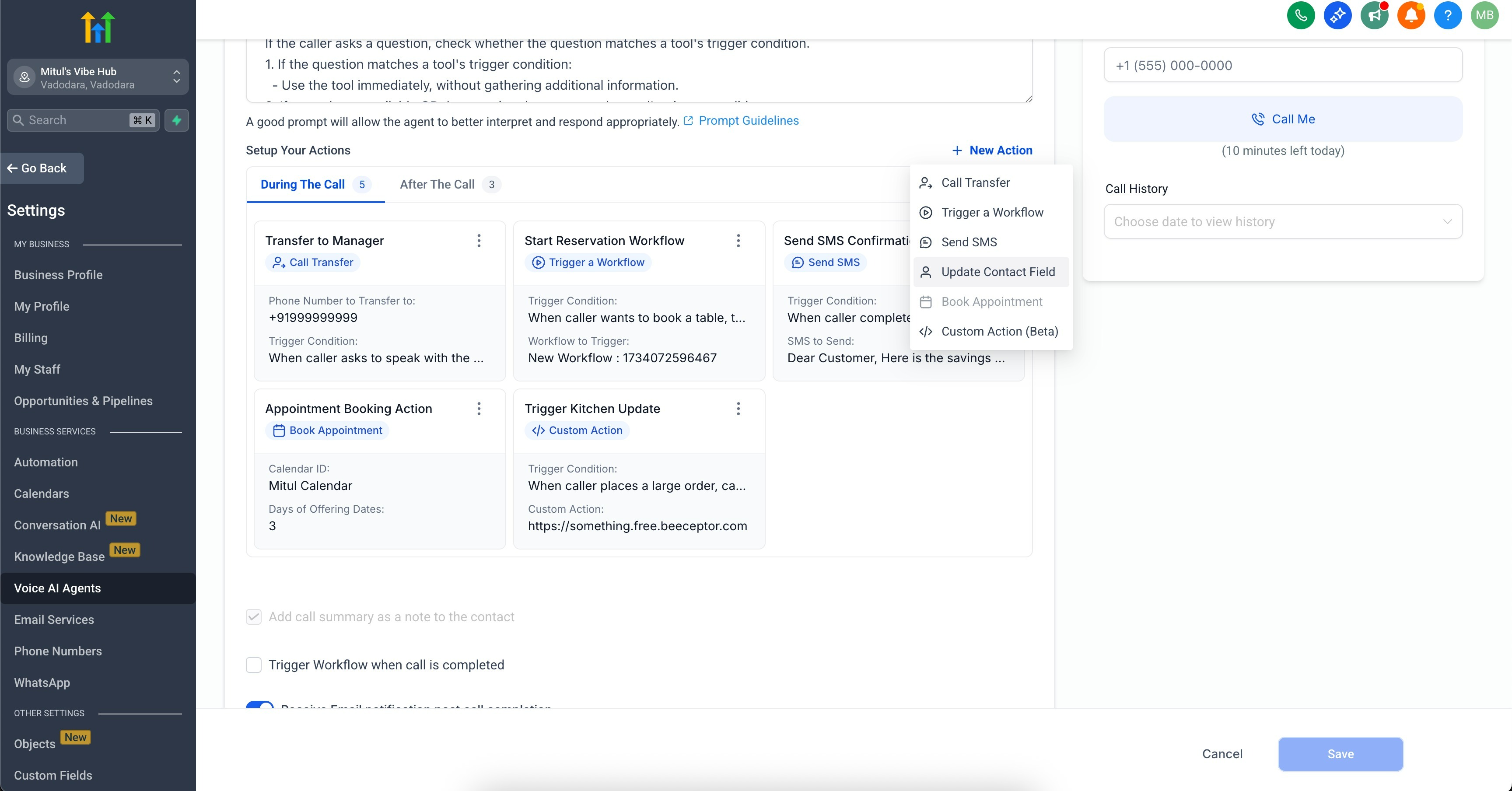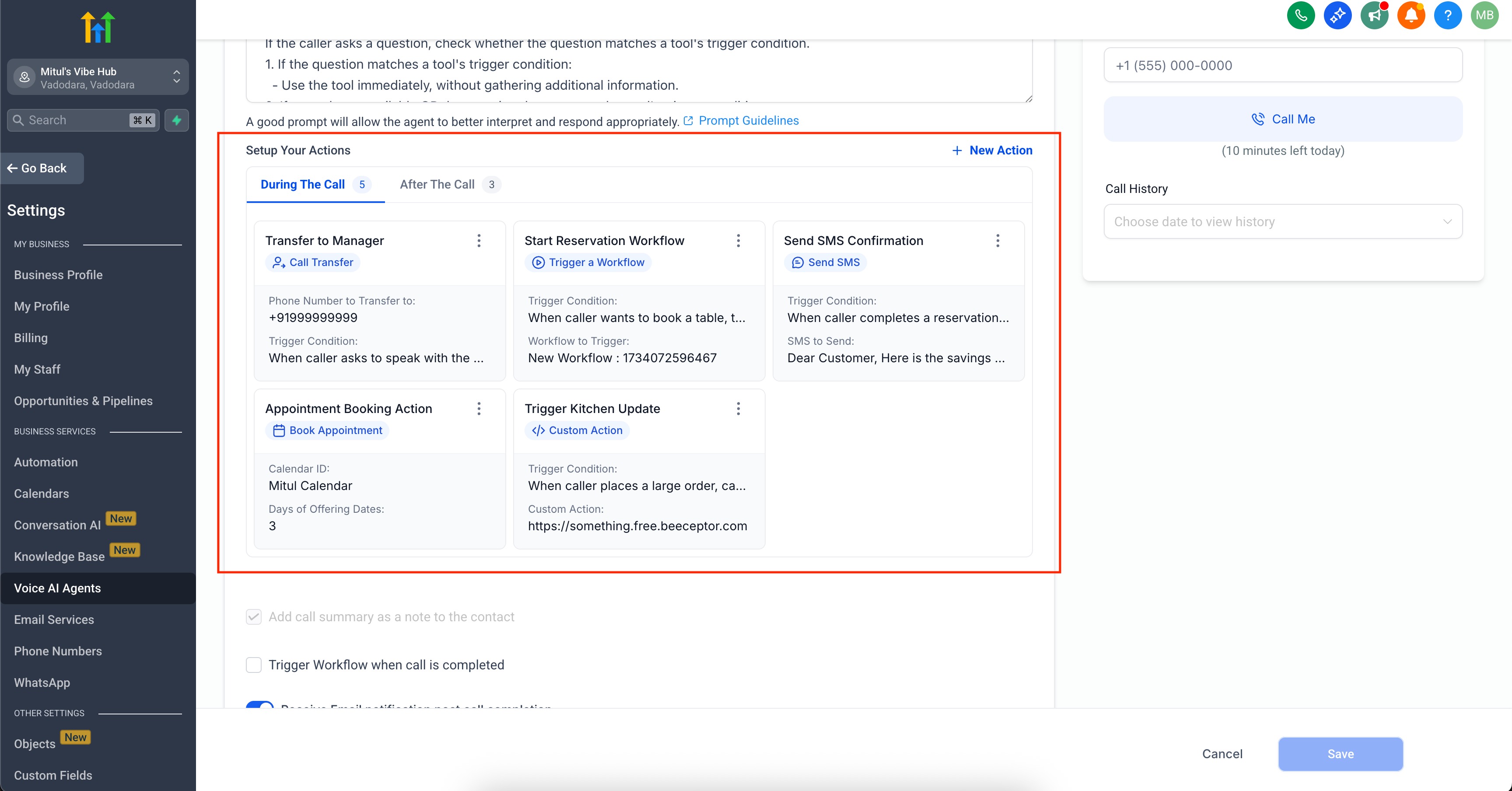The Action Builder for Voice AI has been completely redesigned to offer a cleaner, faster, and more intuitive experience. This update introduces a card-based layout, tabbed structure, and streamlined workflows, making it significantly easier to create, manage, and review what your agent does both during and after a call.