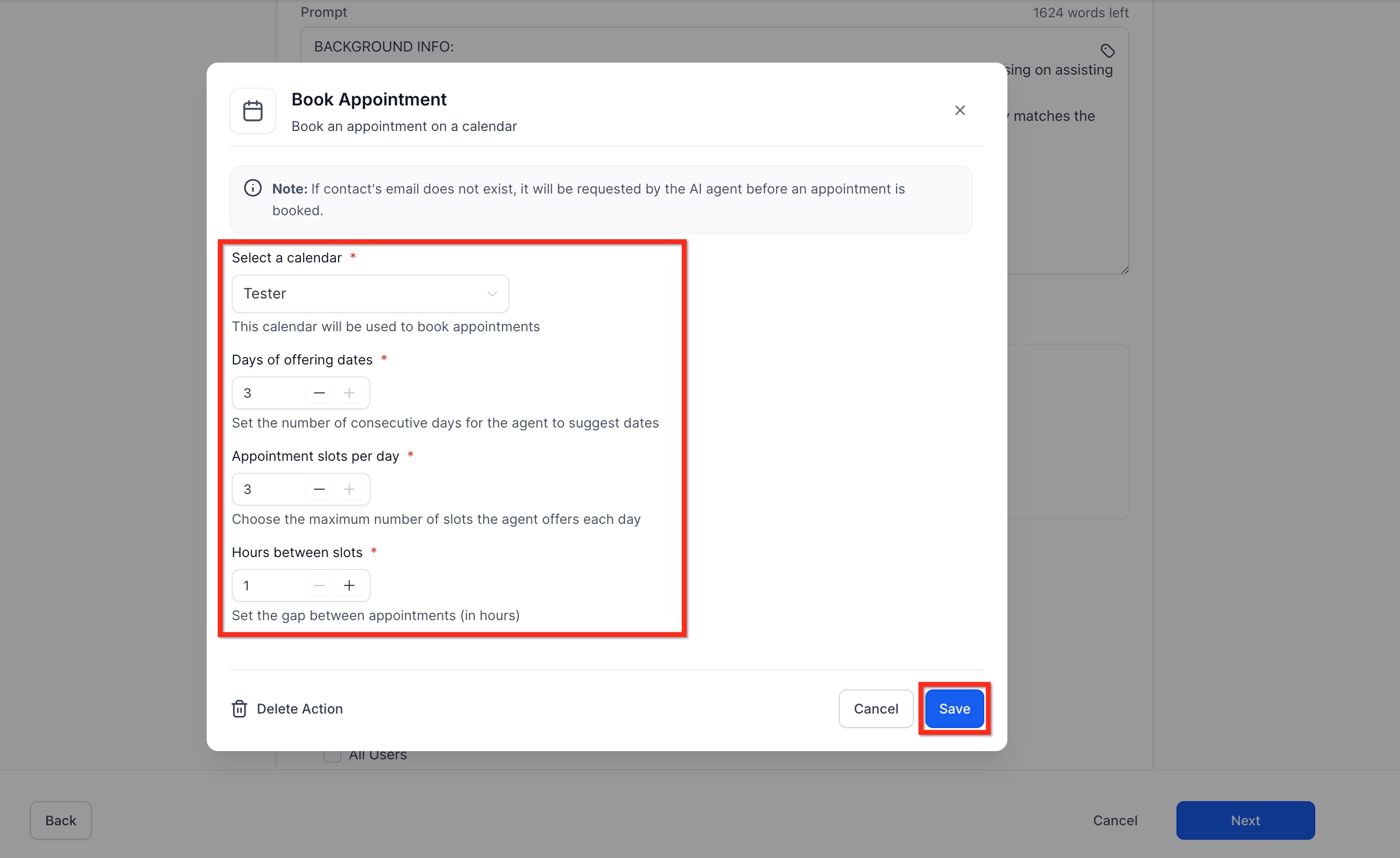 Select Calendar: Choose the calendar that the AI will use for booking appointments.