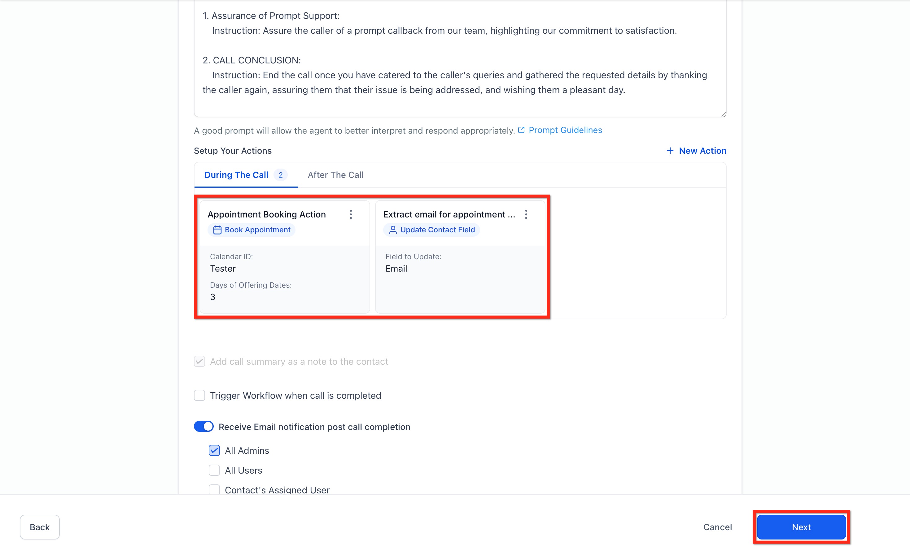 Configured Appointment Booking Action and Extract Email for Appointment Action will show under Setup Your Actions tab.