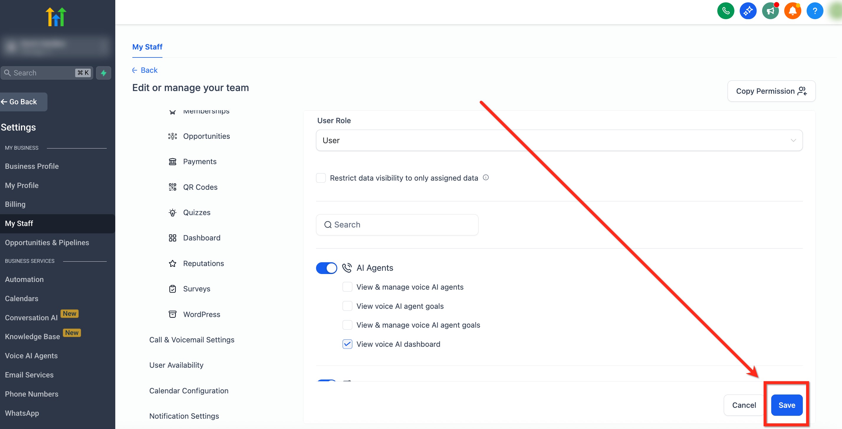 Setting up granular Voice AI permissions uses the Roles & Permissions panel. Follow these steps to configure the granular permissions:
