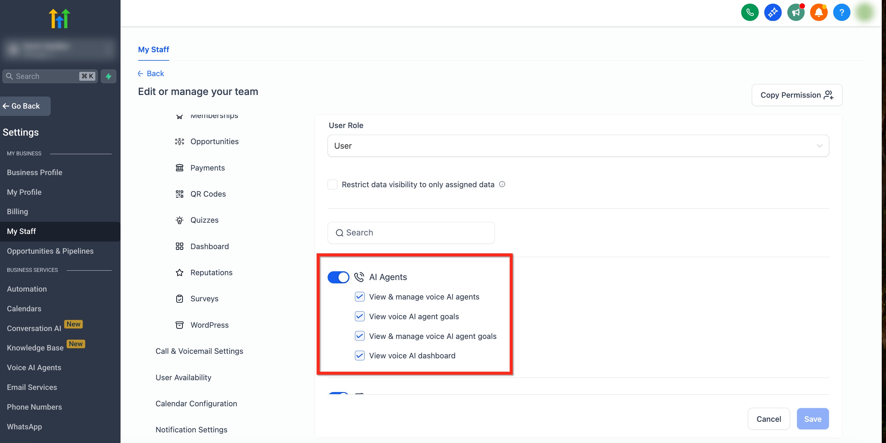 Granular permission controls for Voice AI Agents give teams the flexibility to assign role-specific access while protecting sensitive configurations and workflows. Using four distinct toggles, you can govern different parts of the Voice AI experience. Instead of an "all‑or‑nothing" approach, you can decide who creates agents, who tweaks their goals, and who sees performance data.
