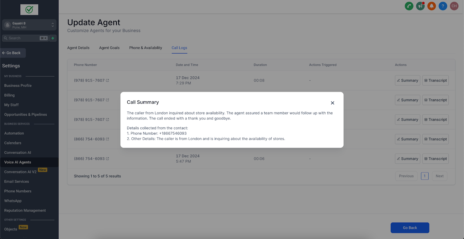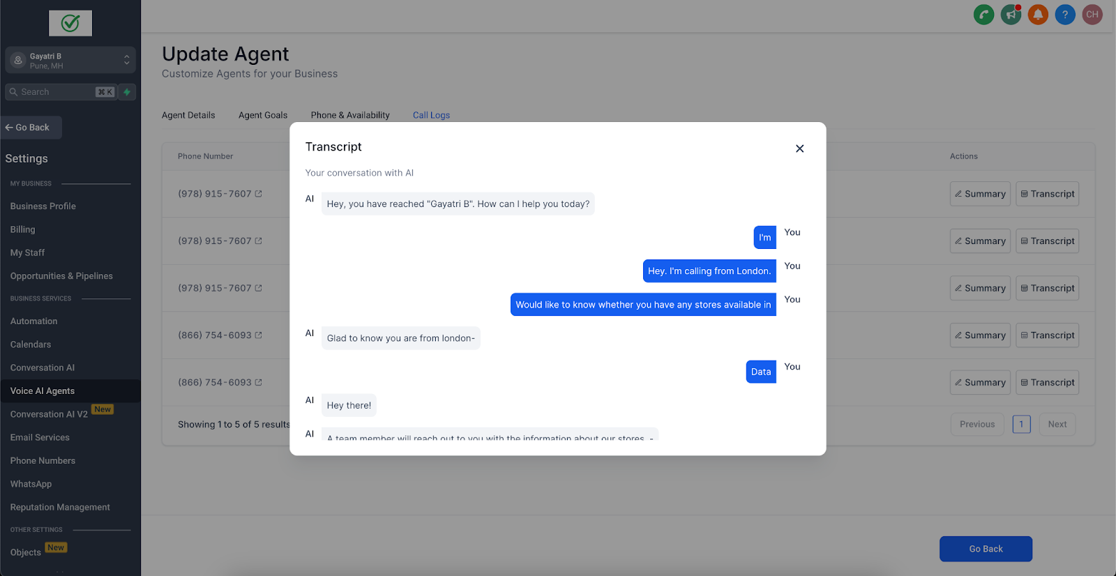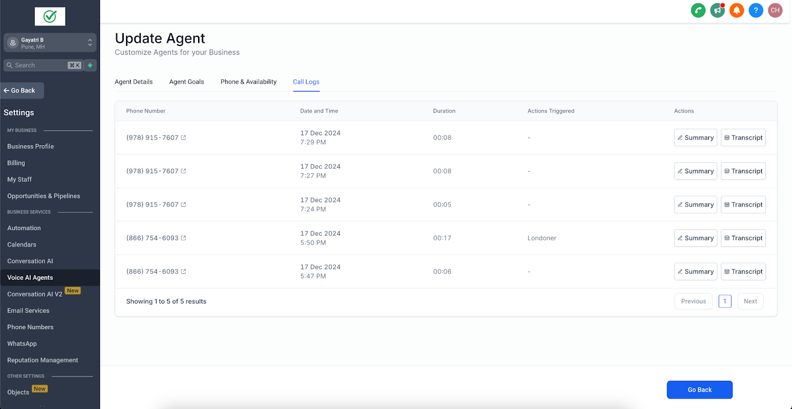 The Call Logs feature gives you complete visibility into every call handled by your Voice AI agents. Whether you need to review performance, understand customer interactions, or ensure quality control, Call Logs provide detailed insights in one place.
