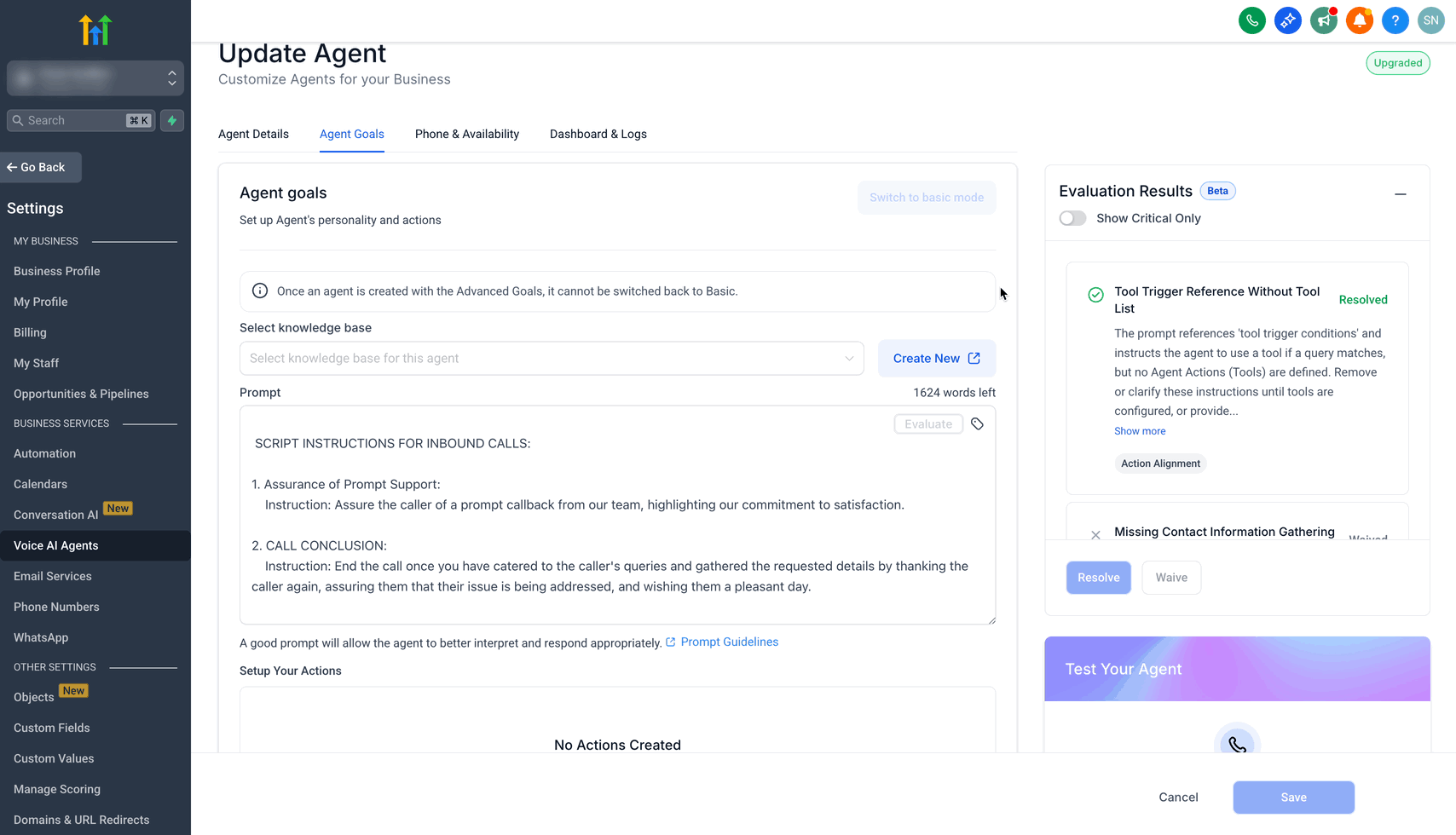 The Voice AI Prompt Evaluator is a feature within HighLevel’s Voice AI module. It allows you to analyze and refine your voice agent prompts instantly by delivering clear improvement suggestions and feedback. With the ability to mark suggestions as resolved or waived and re-evaluate prompt changes, this tool streamlines prompt optimization to ensure your interactions are engaging and effective.
