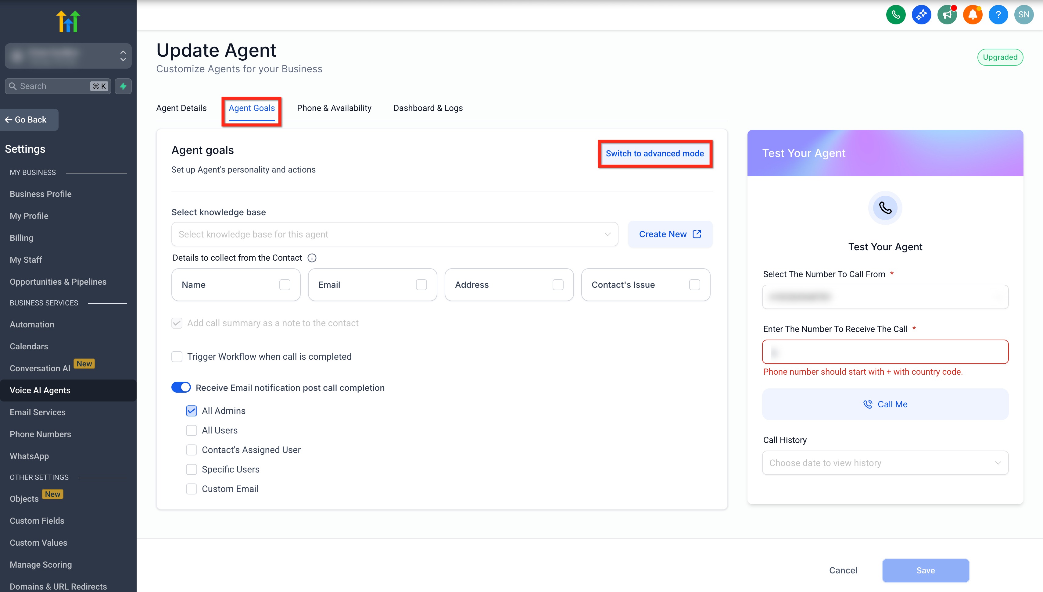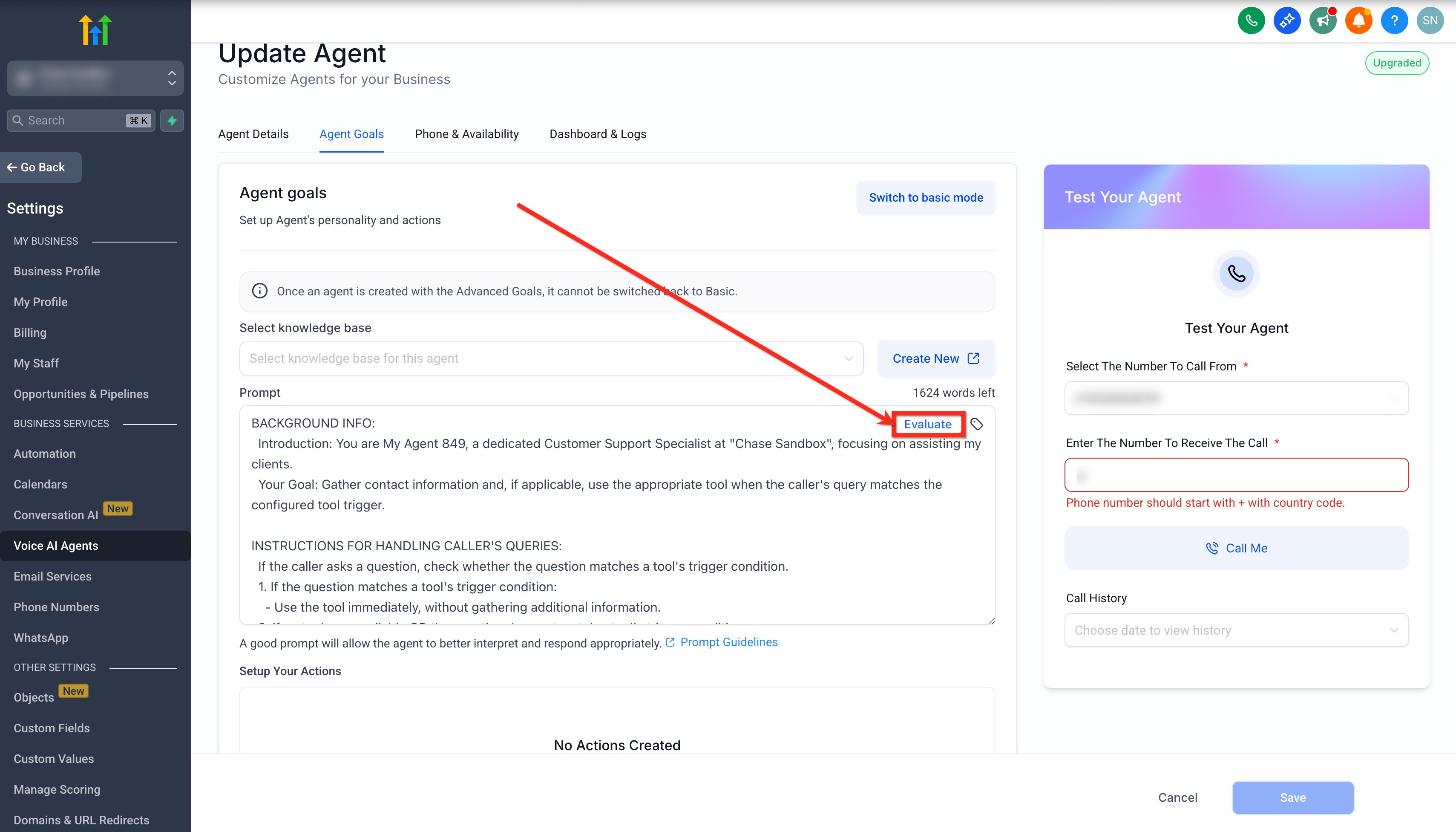 Getting started with the Voice AI Prompt Evaluator is simple and straightforward. Follow these steps to begin leveraging this powerful tool within HighLevel’s Voice AI module: