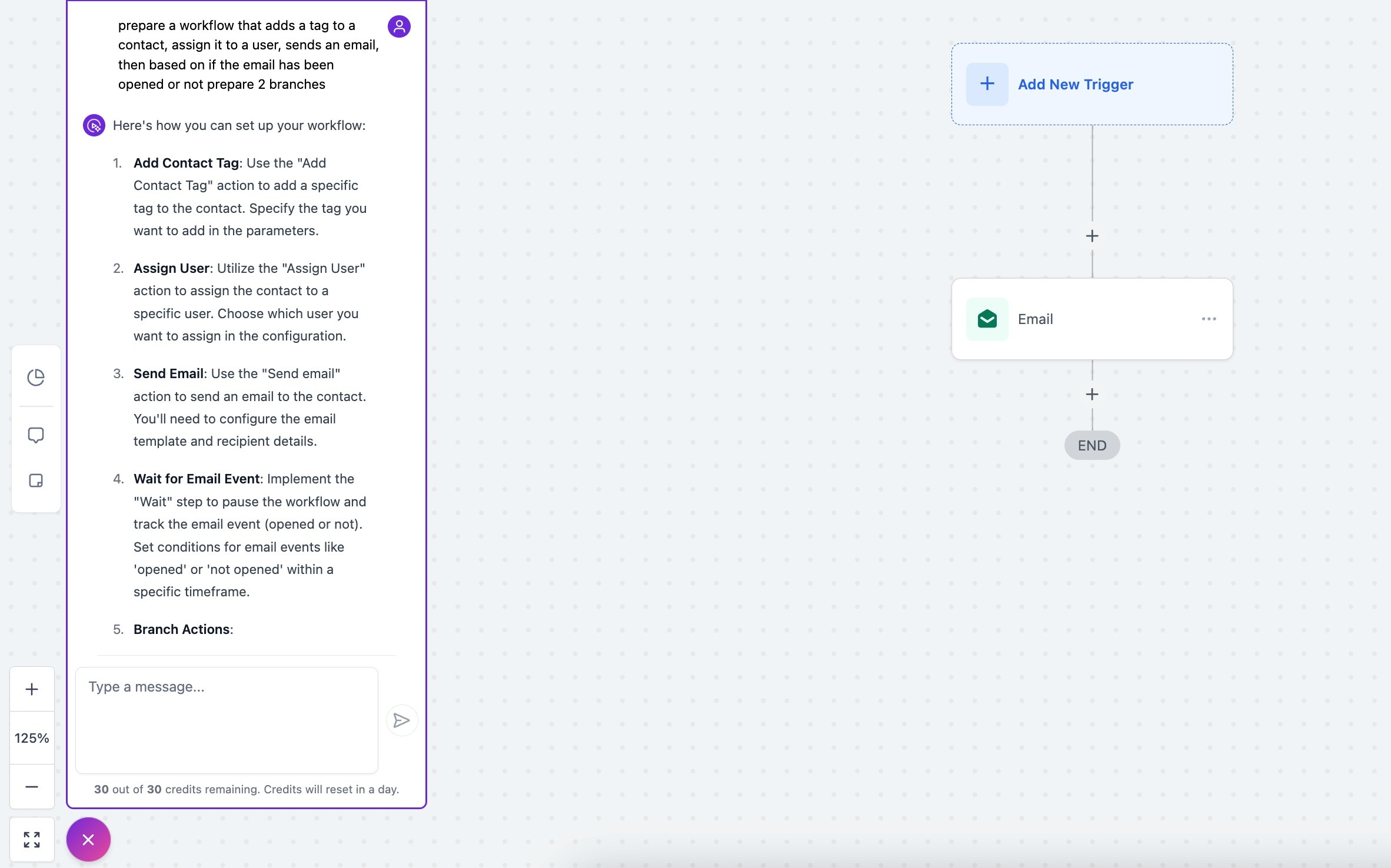 You just have to type what you want to build and Workflow AI will give you the list of actions and triggers to be added to achieve it and how to configure them.