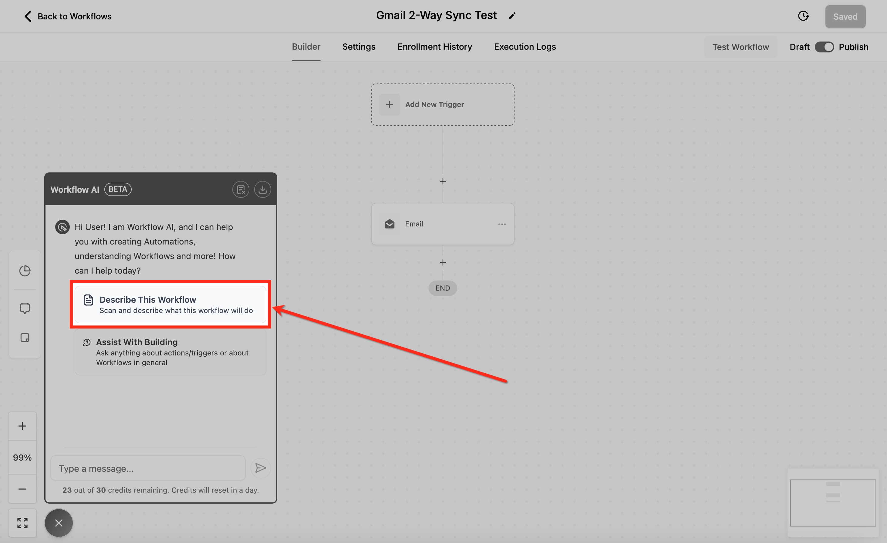 - Analyze Workflow: Click the "Describe this Workflow" button to have Workflow AI analyze your workflow.