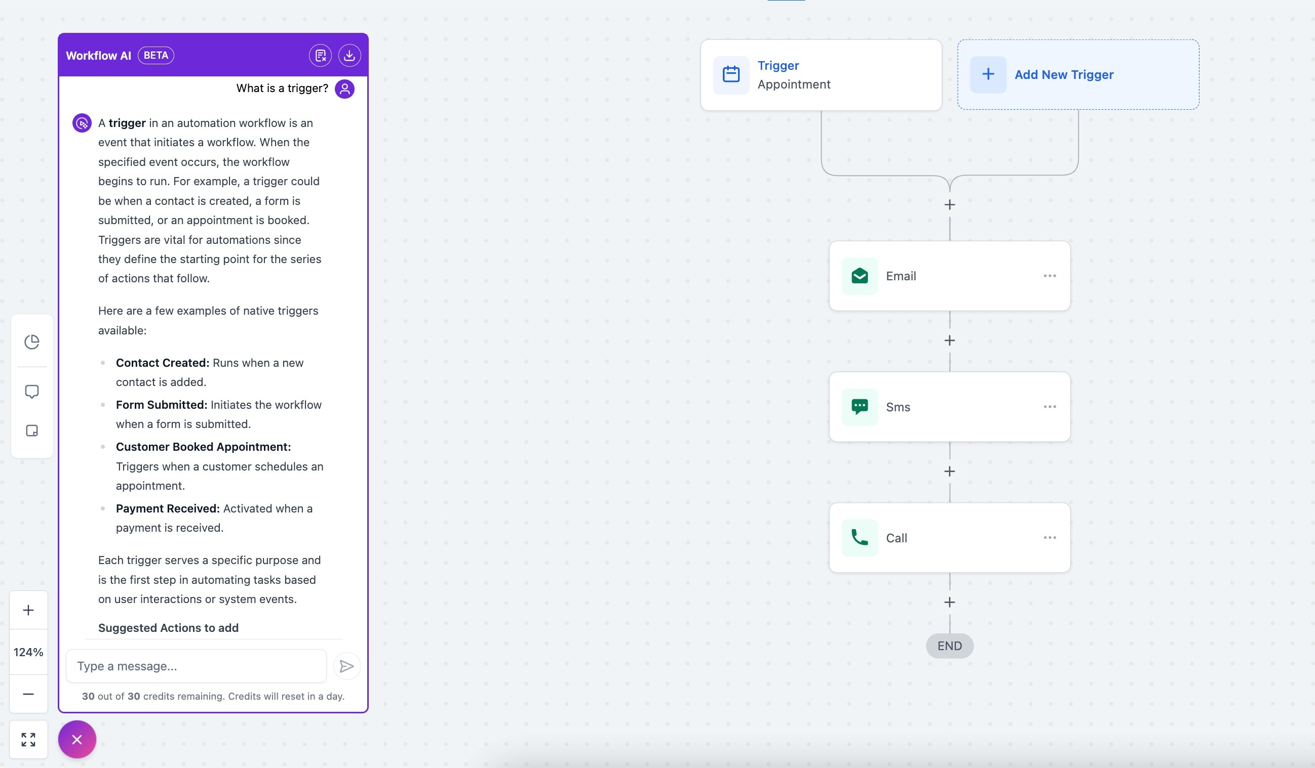 It can even help you add specific actions—like sending an SMS reminder, waiting for confirmation, updating an appointment status, or tagging contacts based on activity.Suggest Next Steps