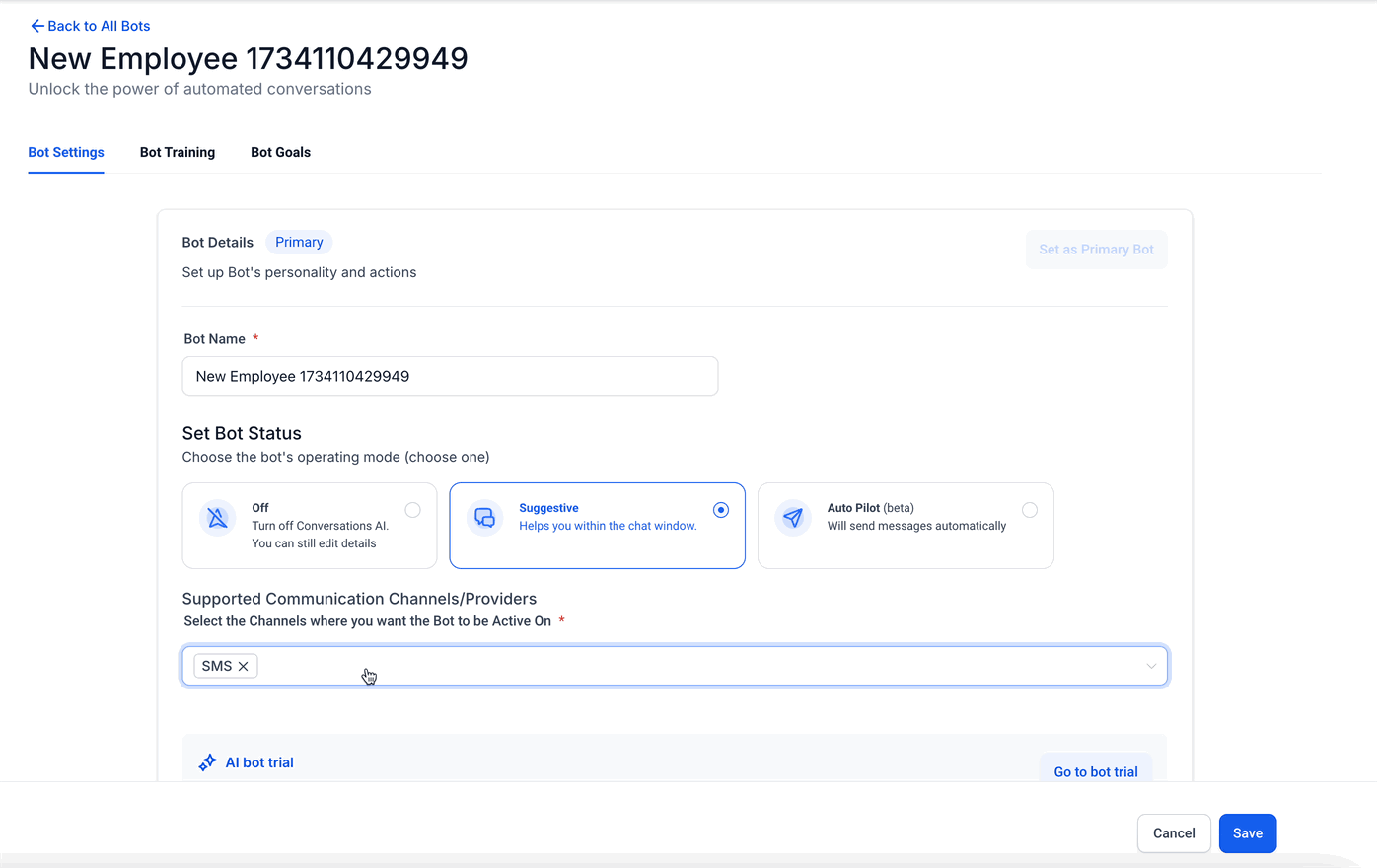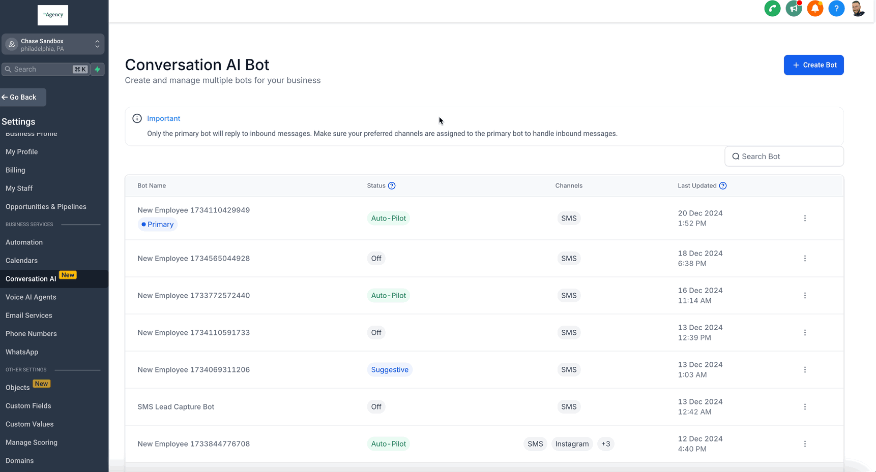 Primary bots handle conversations originating from any assigned communication channels, such as SMS, Facebook, or live chat, as long as those conversations are not already being handled by conversation AI bots inside a workflow. They act as the default responder for your business's communication channels and ensure seamless interaction with customers.