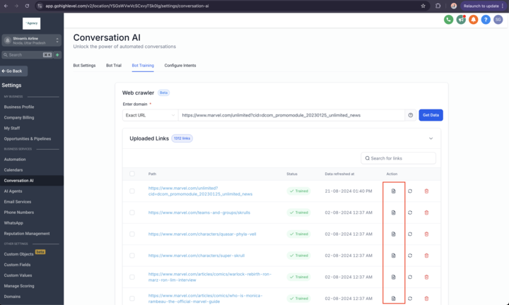Go to the Bot Training tab. In the Uploaded Links table, you'll find a document icon next to each website URL.