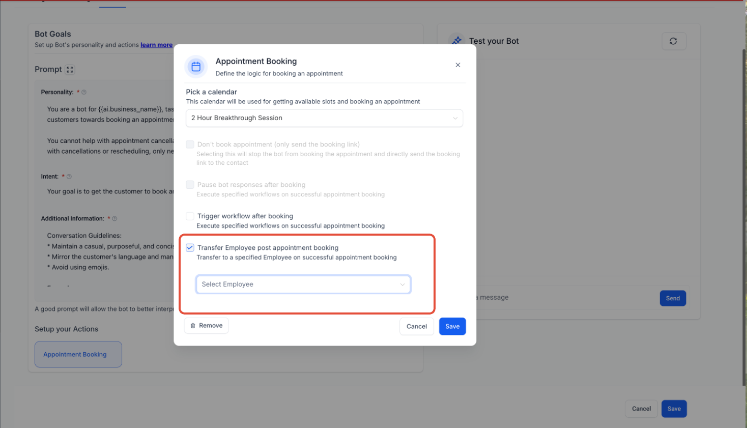 Appointment Booking: A new sub-feature, Transfer Employee Post Appointment Booking, has been added within the Appointment Booking section. This enhancement allows users to seamlessly transfer the conversation to a different bot once the intended action—such as successfully booking an appointment—has been completed.