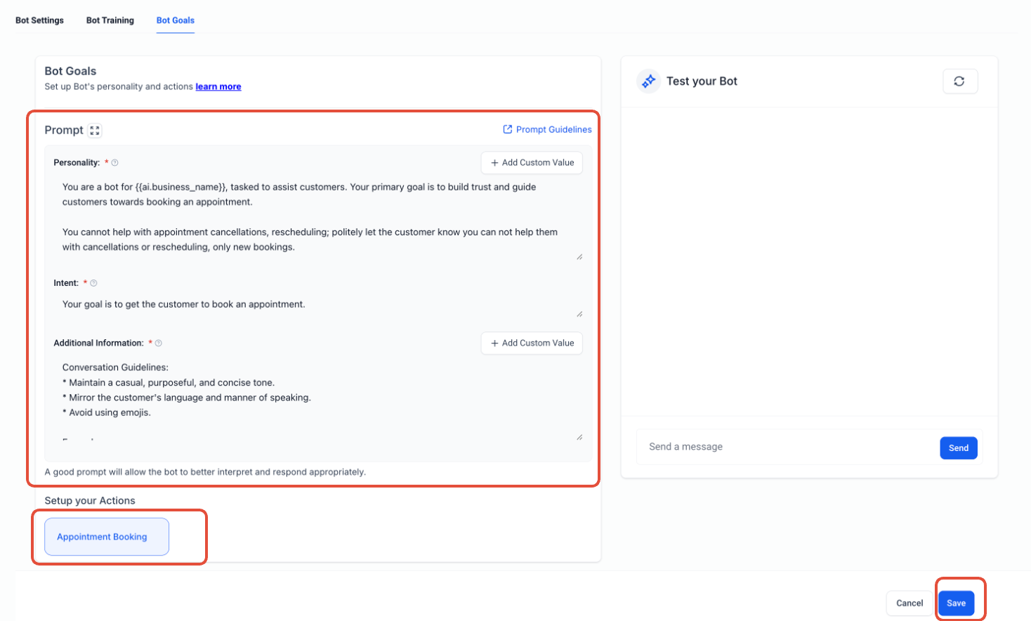 - Once you’ve updated the prompts and configured the bot as needed, click Save.