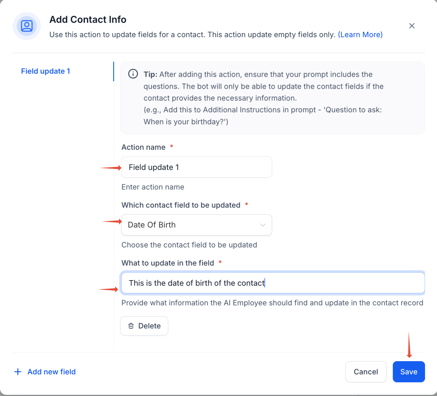 - For example, if you're creating a field to update the date of birth, make sure to include a clear instruction like: