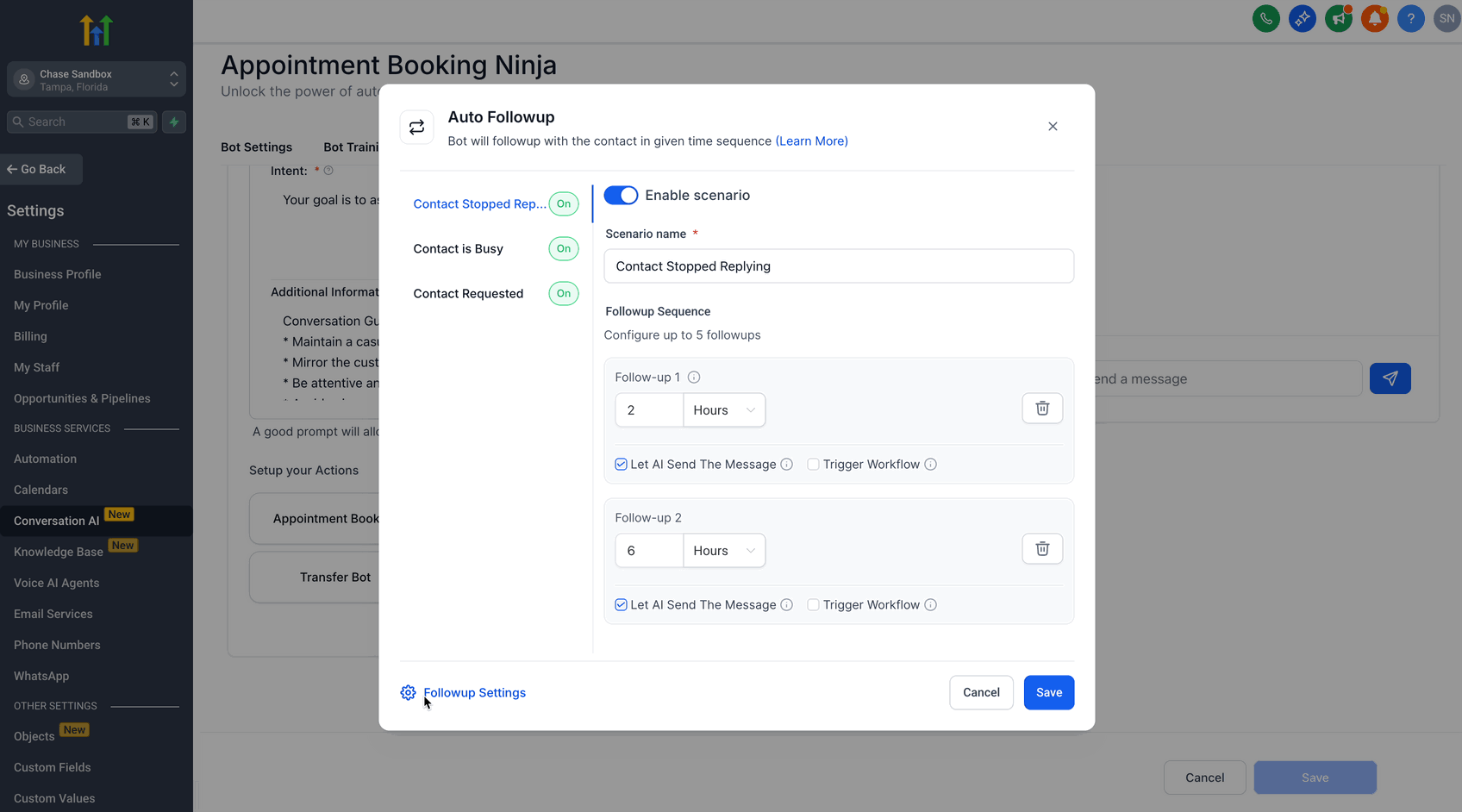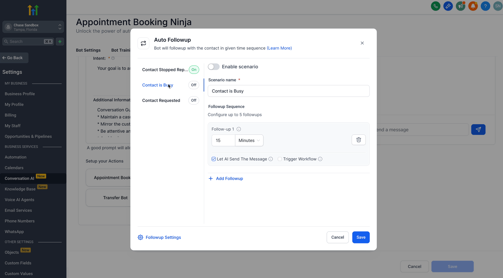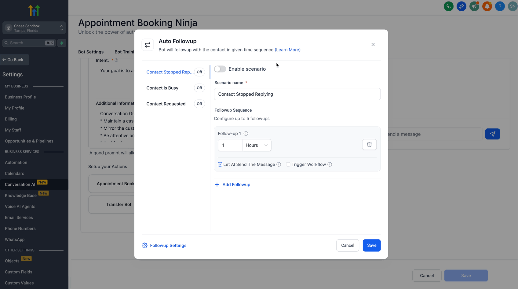 Note: Do not trigger another followup through a workflow—this breaks the follow-up logic.Step 1: Navigate to the Conversation AI Bot