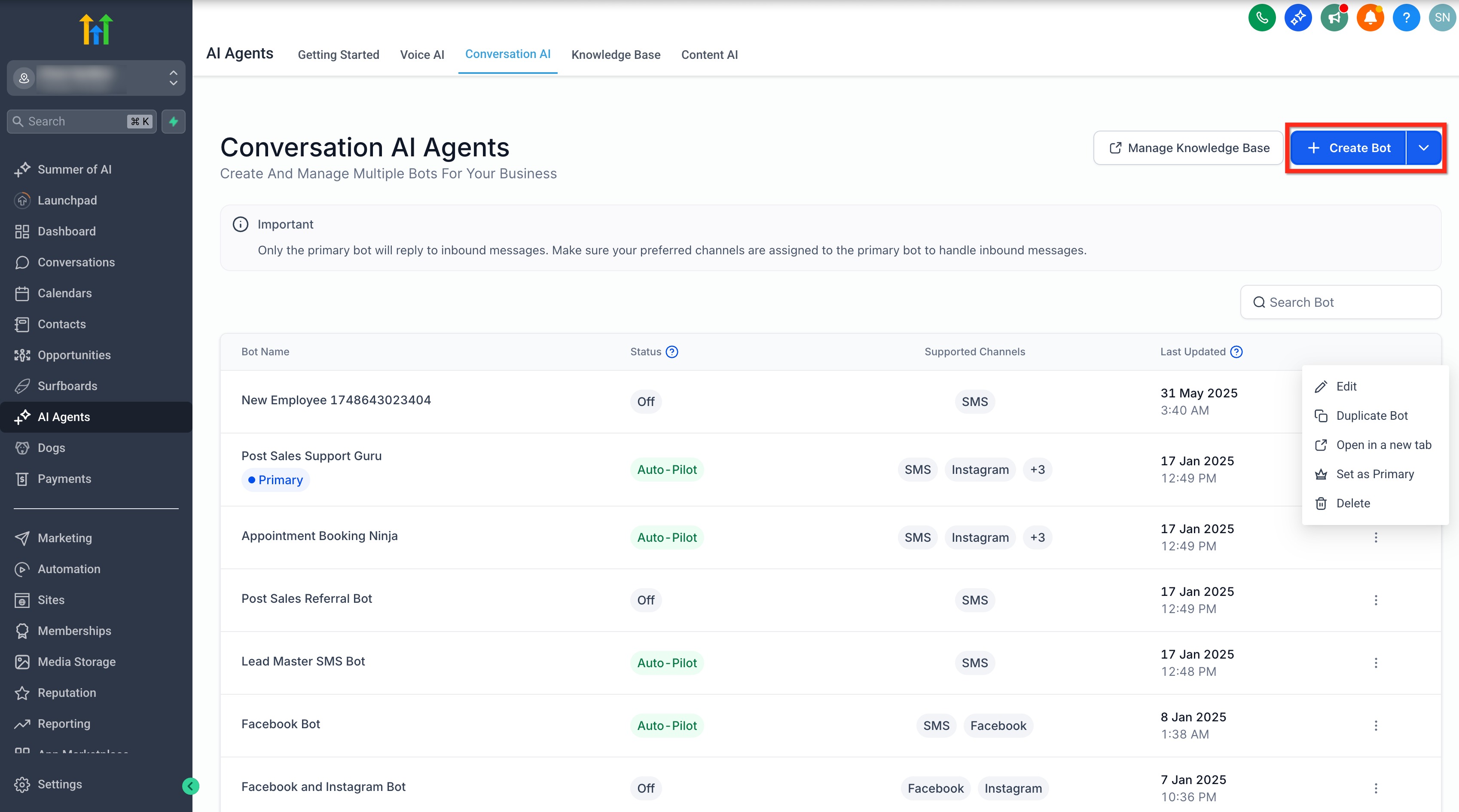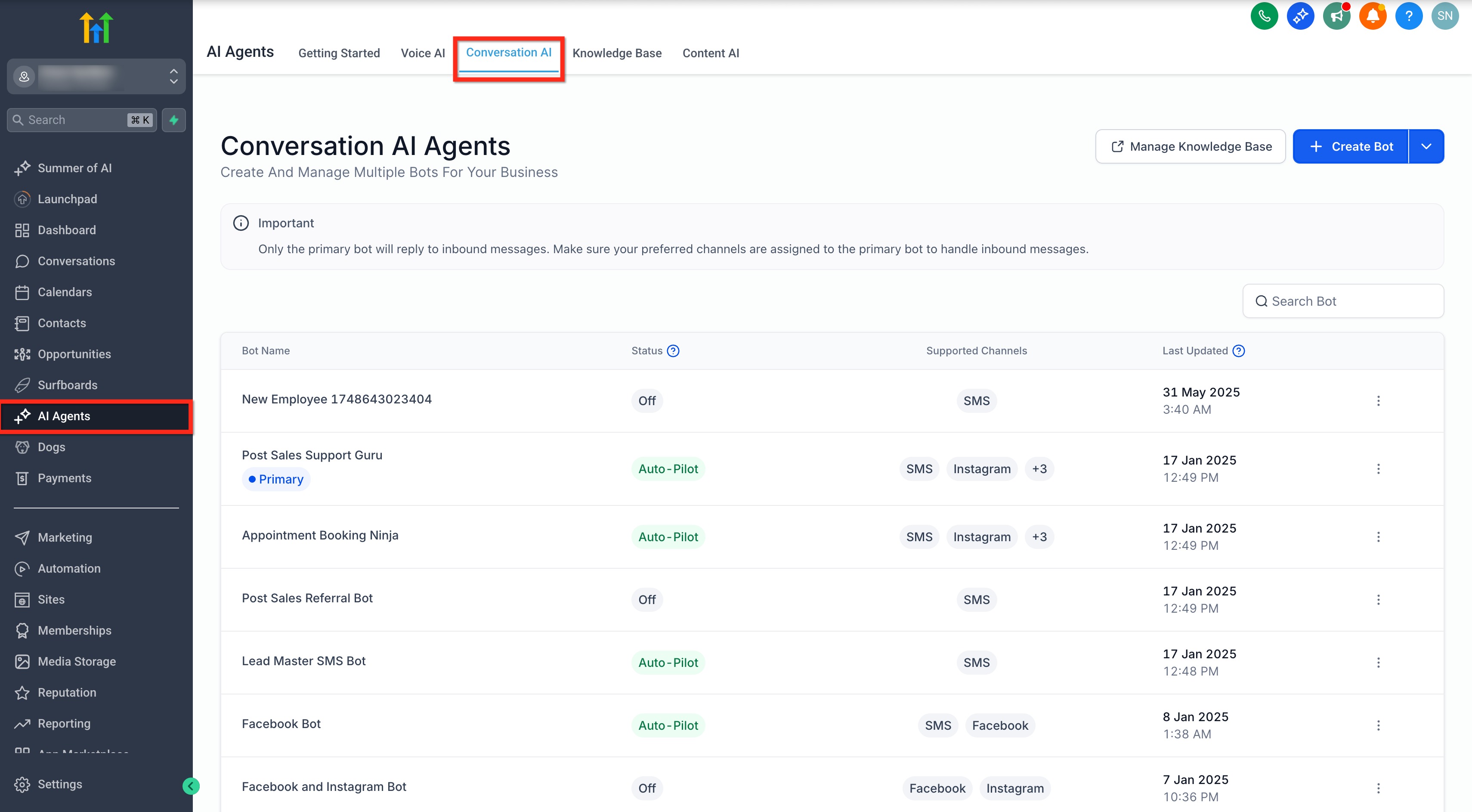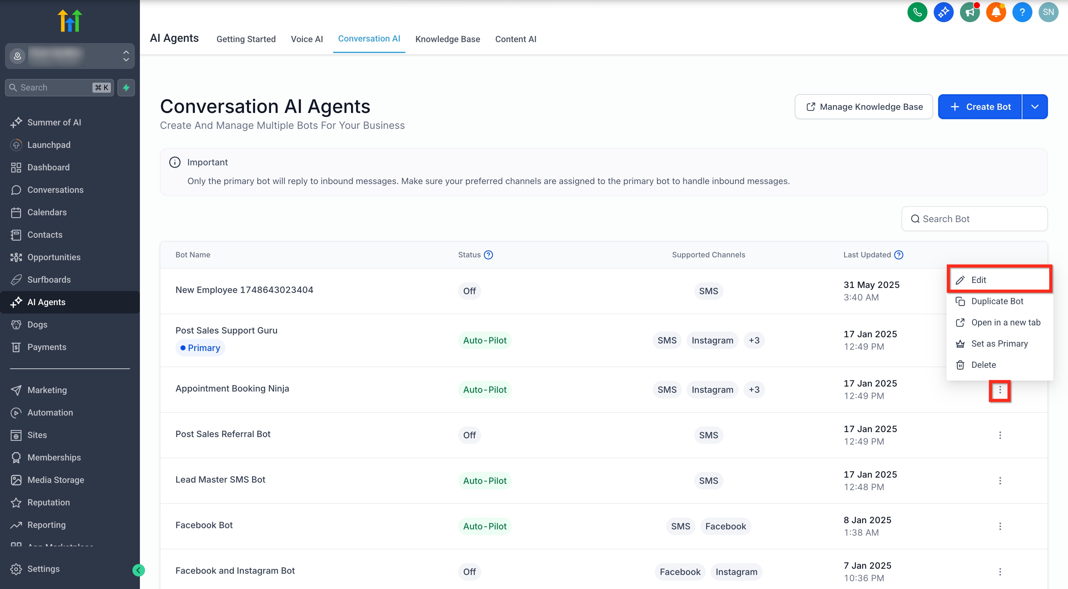 Note: Do not trigger another followup through a workflow—this breaks the follow-up logic.Step 1: Navigate to the Conversation AI Bot