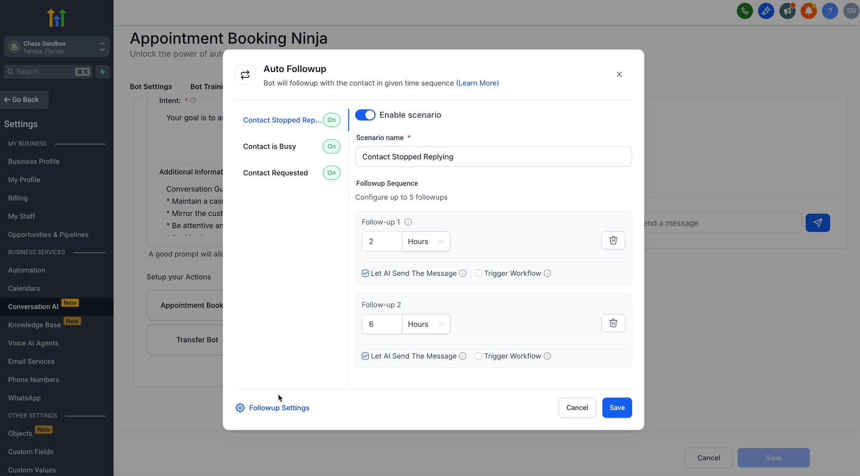 Each follow-up scenario defines when the bot should send follow-ups. HighLevel currently supports 3 main scenarios: