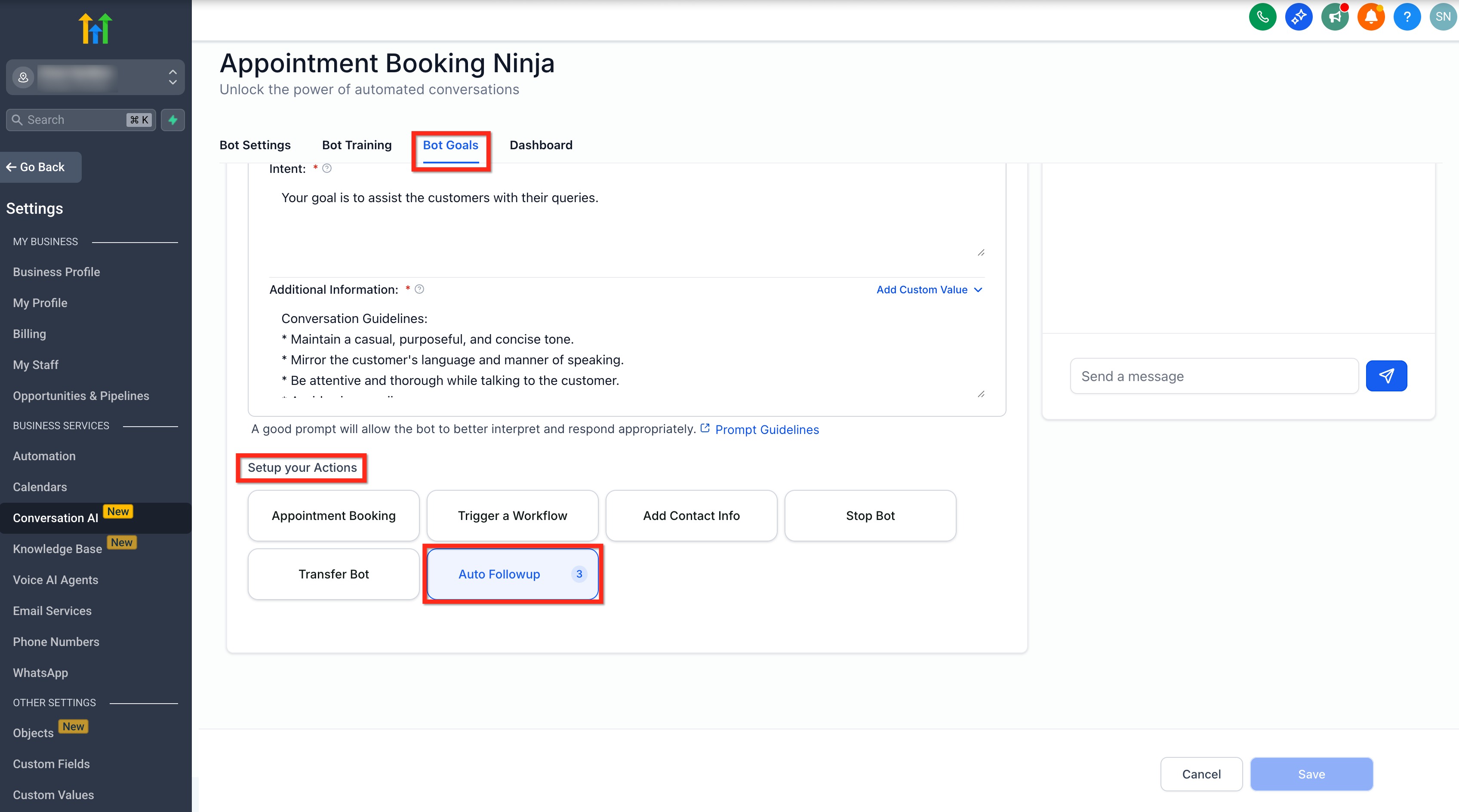 The Auto Follow-Up feature in HighLevel’s Conversation AI empowers your bot to automatically send timely outbound messages to contacts who have gone inactive, asked for a follow-up, or stopped responding—eliminating manual follow-up tasks and complex workflows. This smart automation helps you boost engagement and close more deals, all while maintaining natural, responsive conversations.