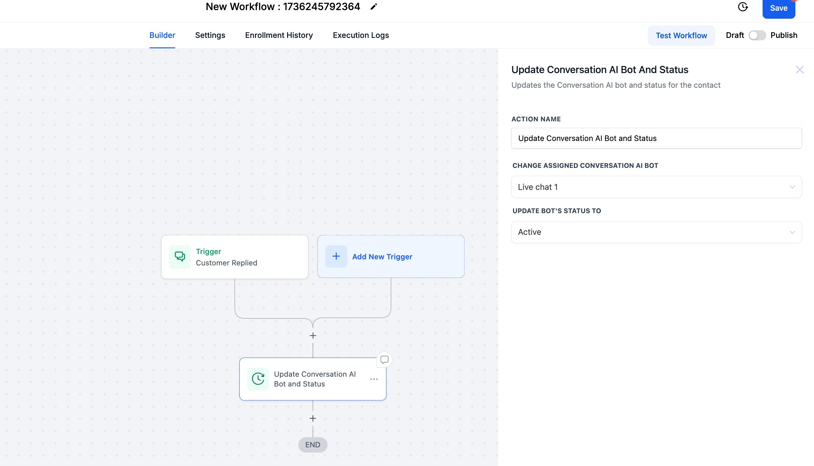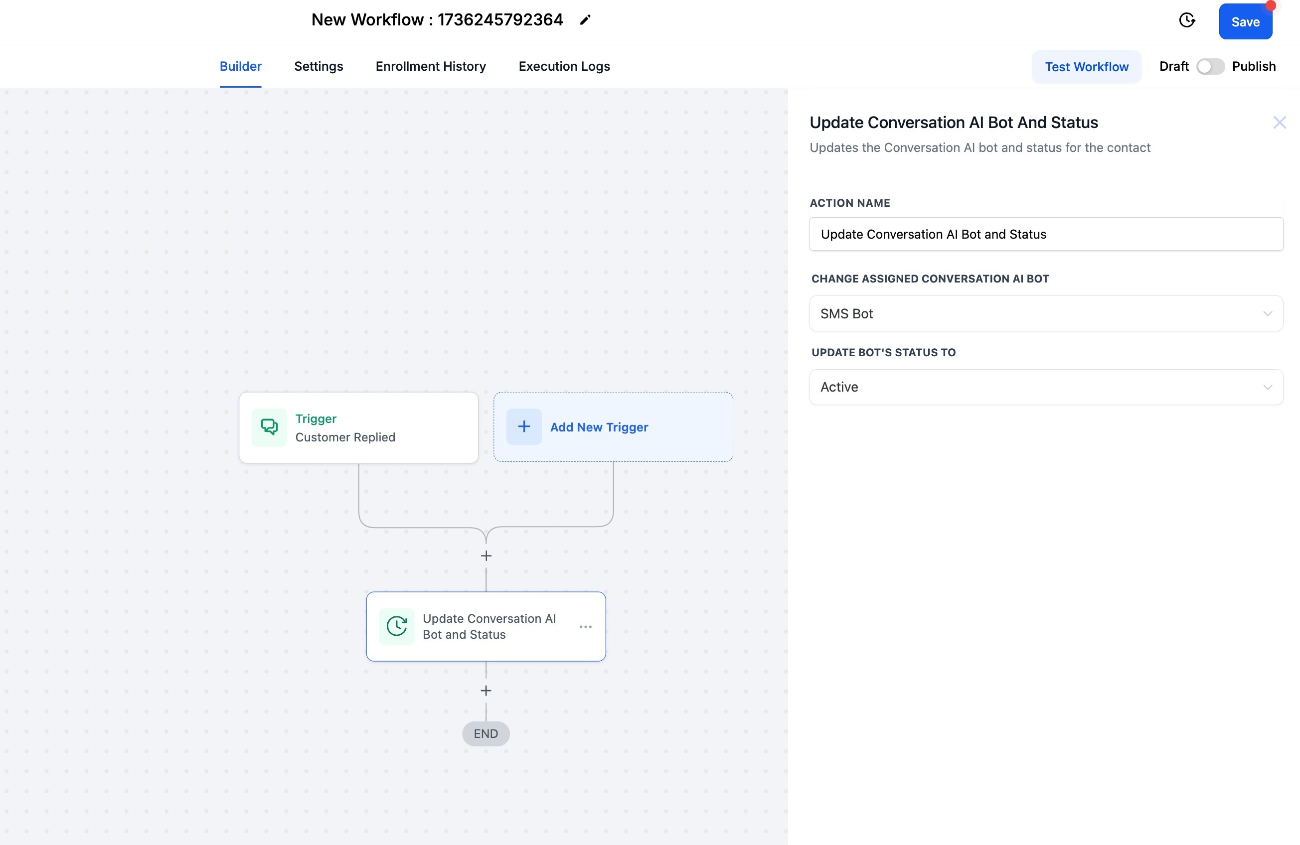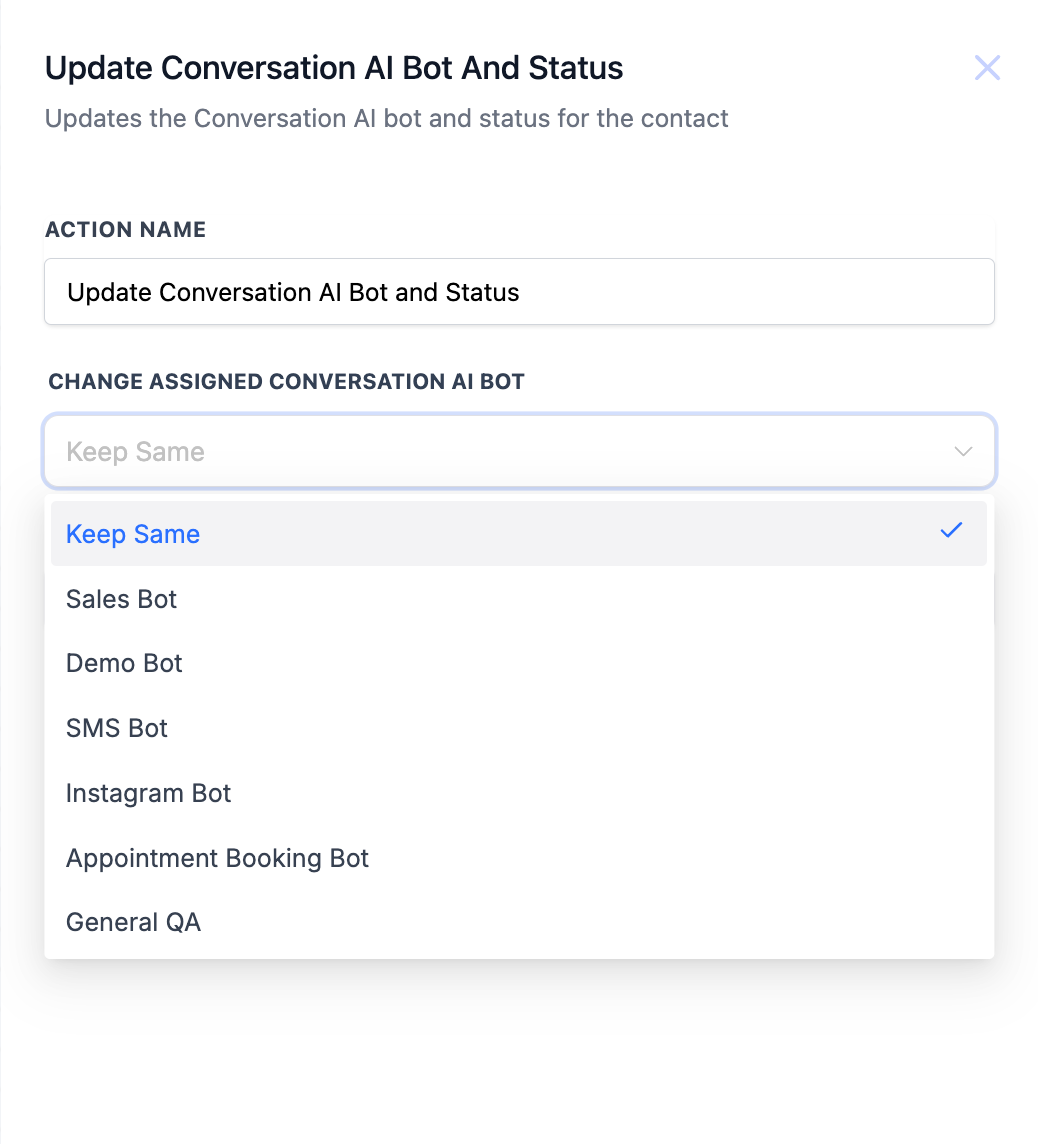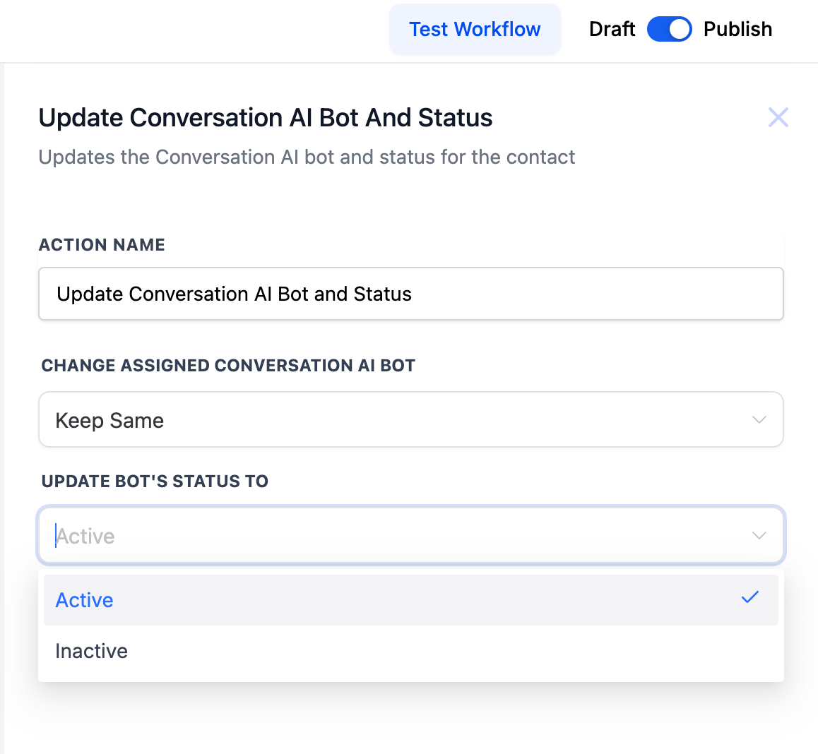 The "Update Conversation AI Bot and Status" action enables users to assign a specific Conversation AI bot to a contact and automatically update its status (Active or Inactive). This action streamlines the management of Conversation AI bots for individual contacts, ensuring efficient interactions based on their journey, specific triggers, or customized criteria.