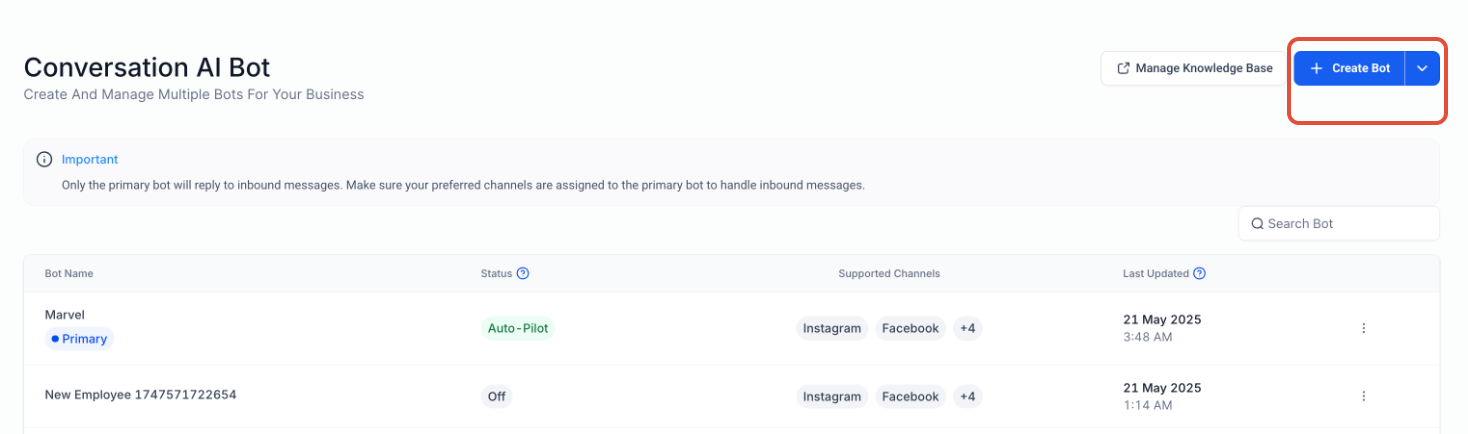 Yes! From the bot creation screen, click the dropdown arrow next to “Create Bot” to choose your setup method.