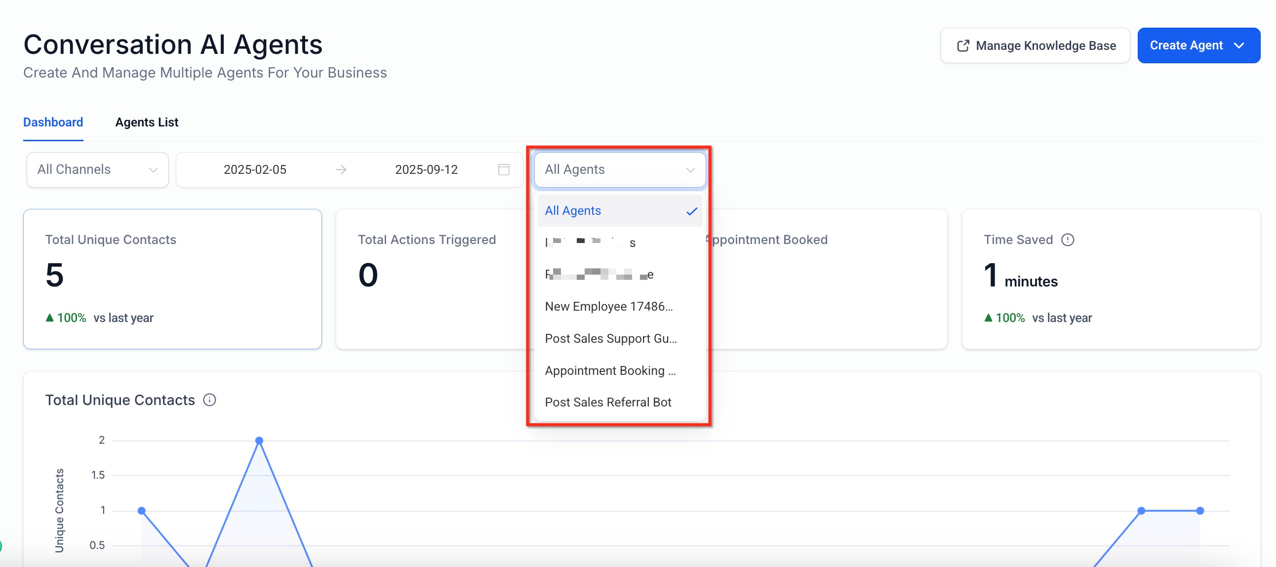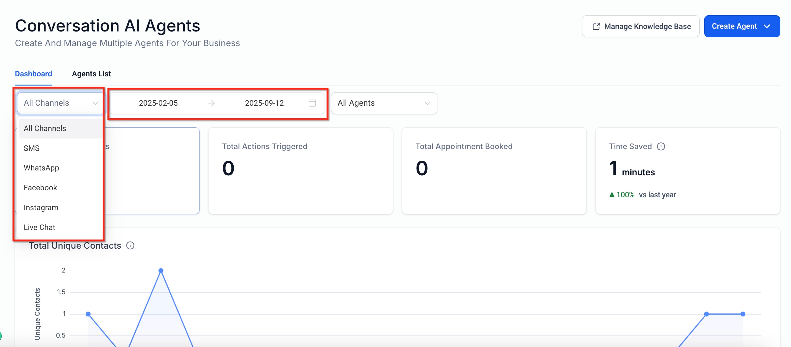 Accessing the dashboard is simple and only takes a few clicks. Here you can access the metrics based on date range, communication channels, and also through your desired AI Agent.