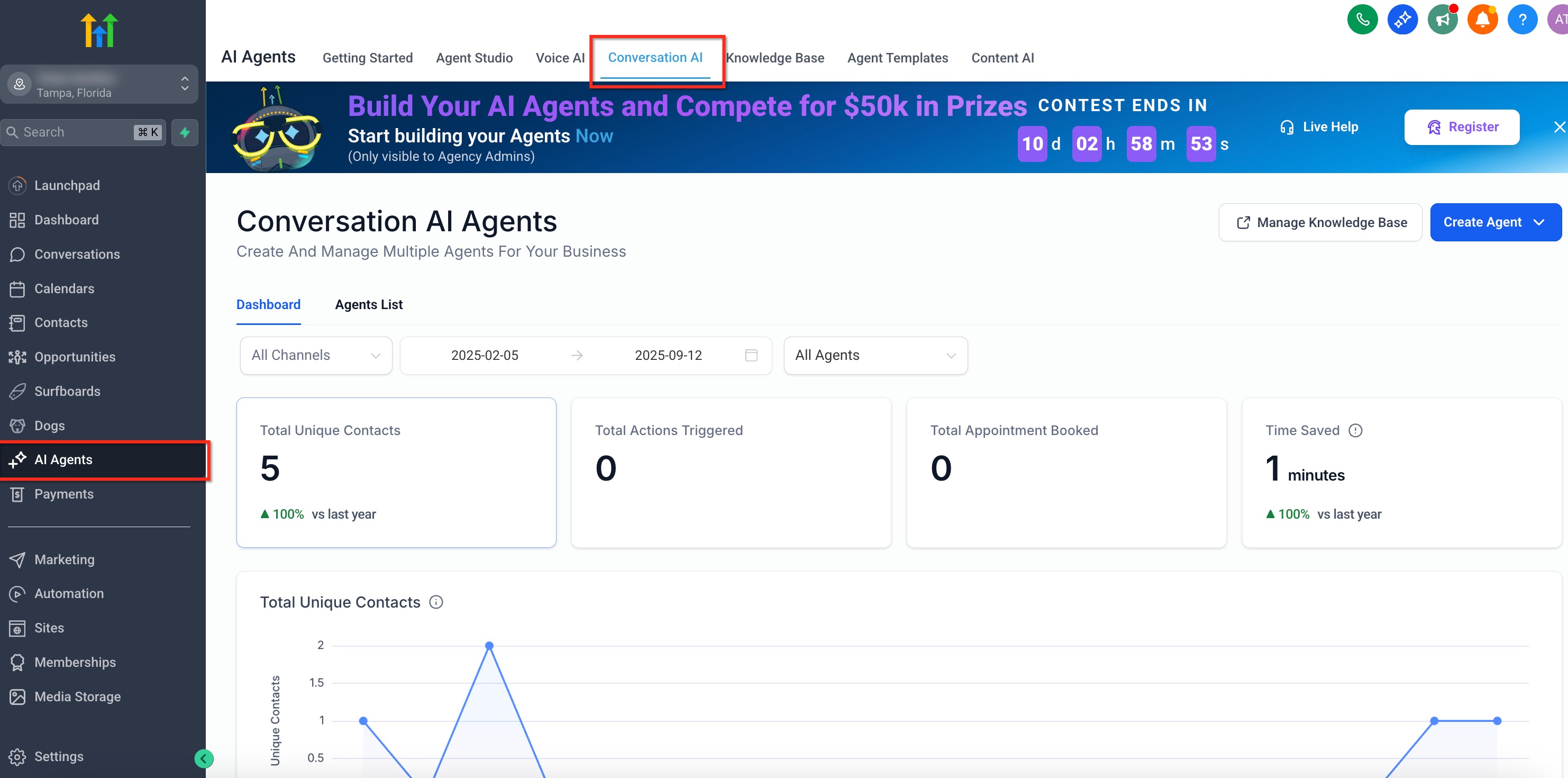 The Conversation AI Agents Dashboard provides a unified, high-level view of performance across all Conversation AI agents in your HighLevel account. Instead of visiting each agent’s page to gather insights, you can analyze cross‑agent activity from a single screen and then drill into a specific agent as needed.