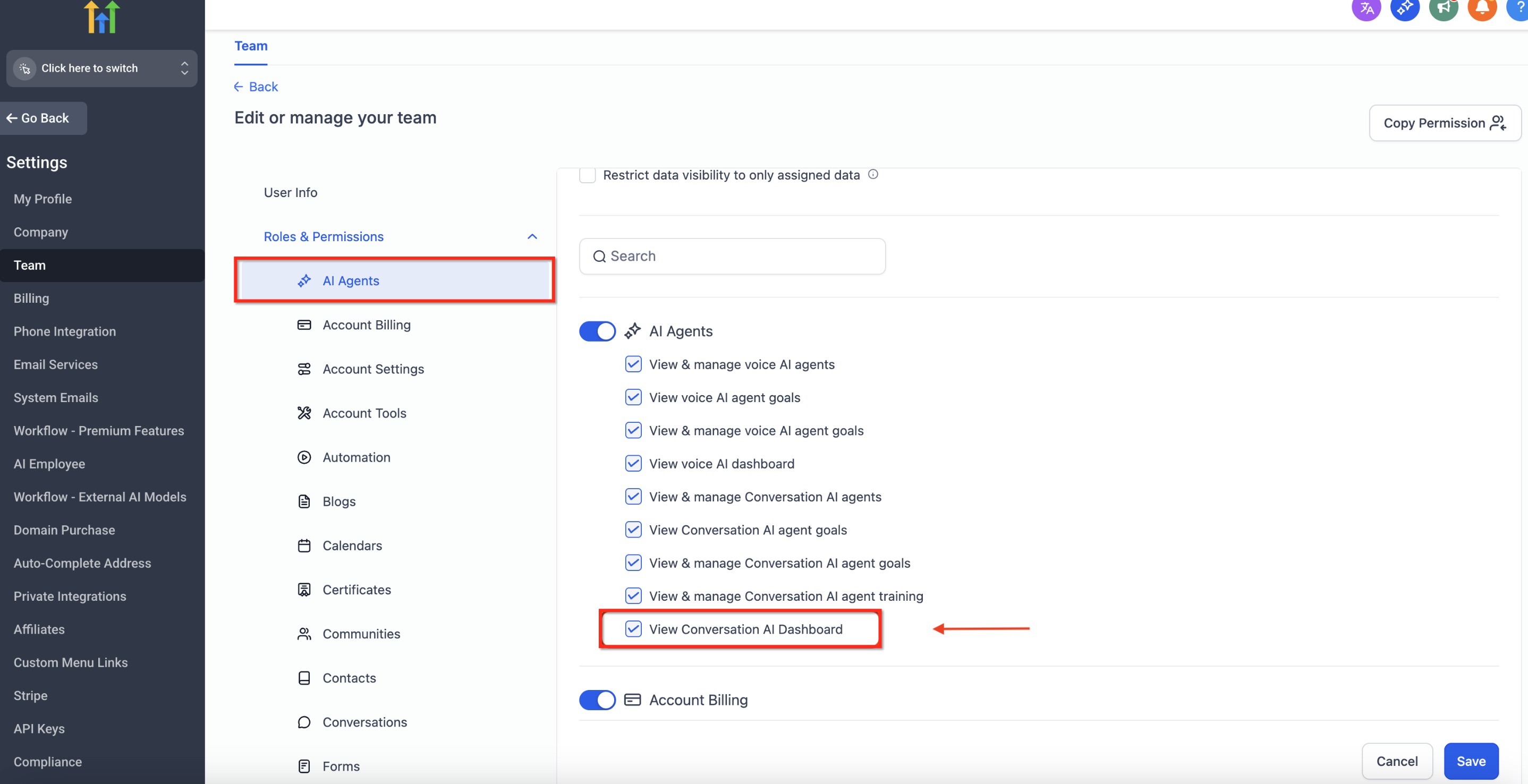 Admins can toggle access via Agency Settings → Team → Edit User → Roles & Permissions → AI Agents → View Conversation AI Dashboard.