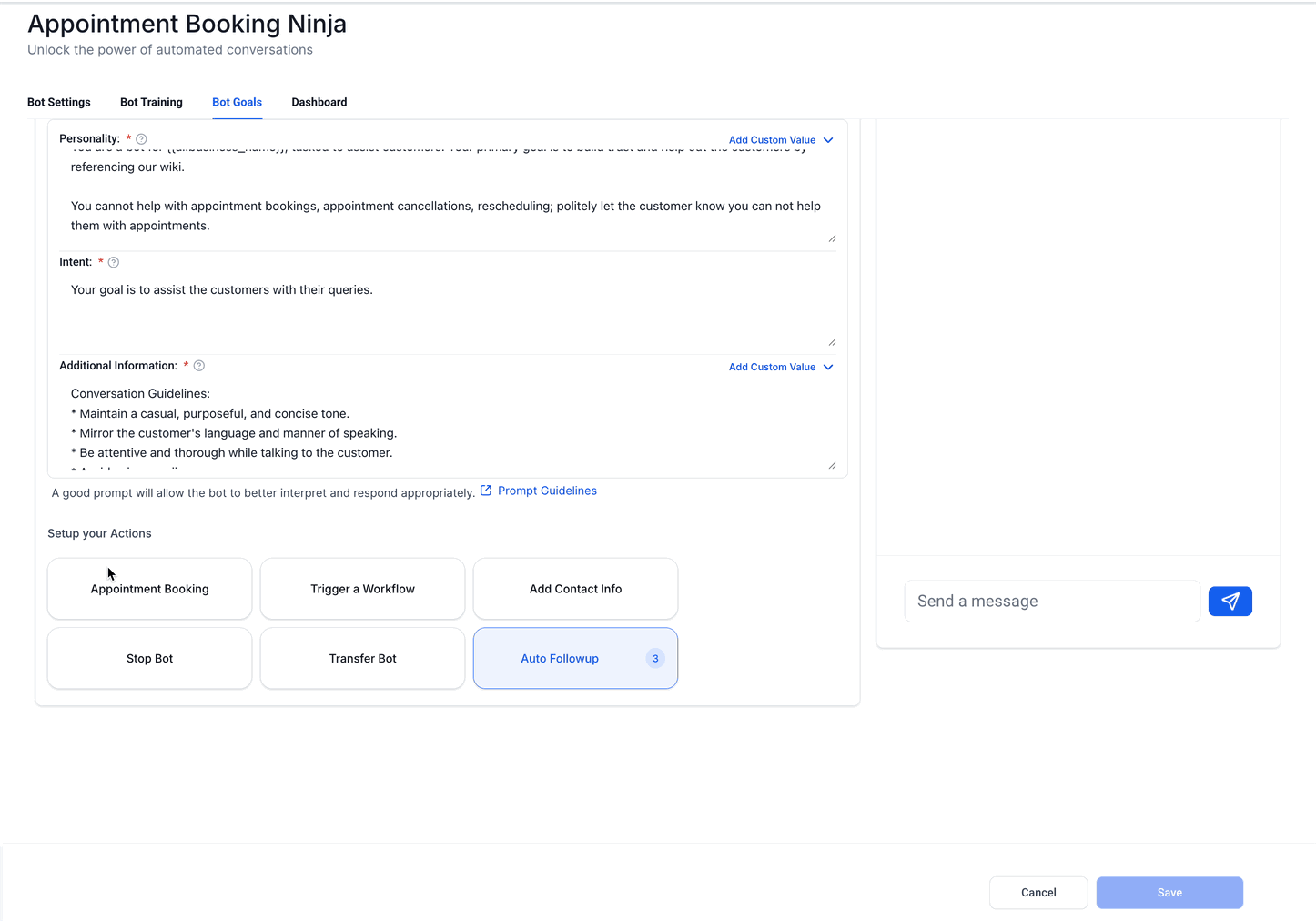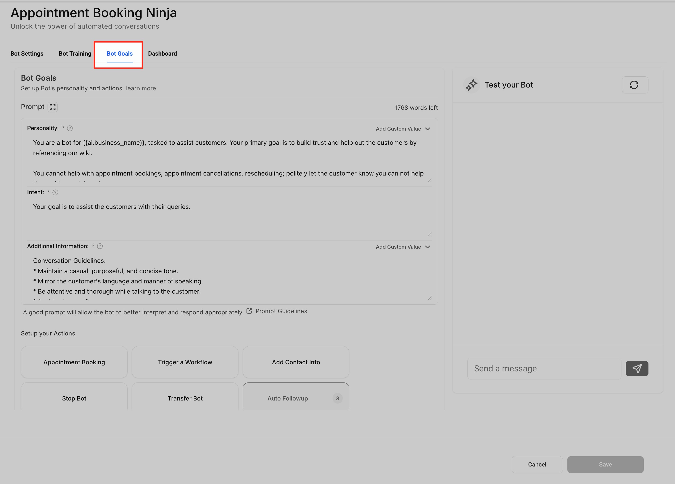 - Use the Bot Trial feature to simulate conversations and ensure the cancellation and rescheduling flows work as intended before going live.