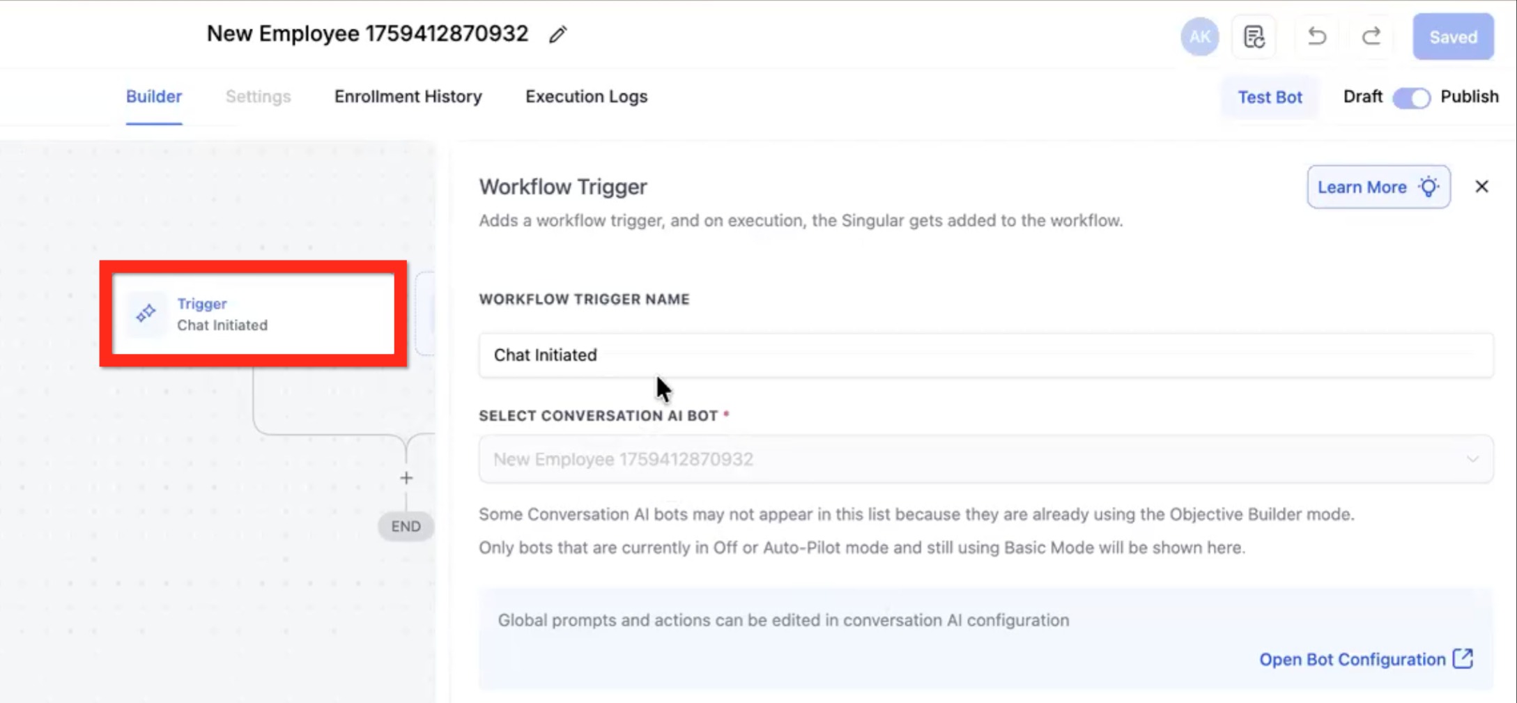 The default trigger is Chat Initiated. This trigger is the only way to start the flow.