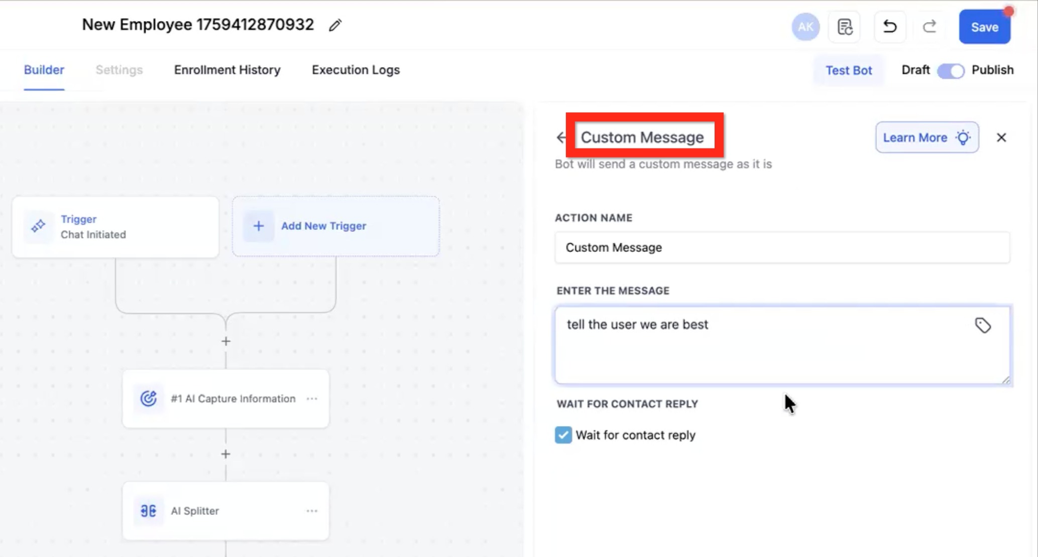 • Wait for contact replyIf checked, the bot Flow will only move to the next step after a reply is received.