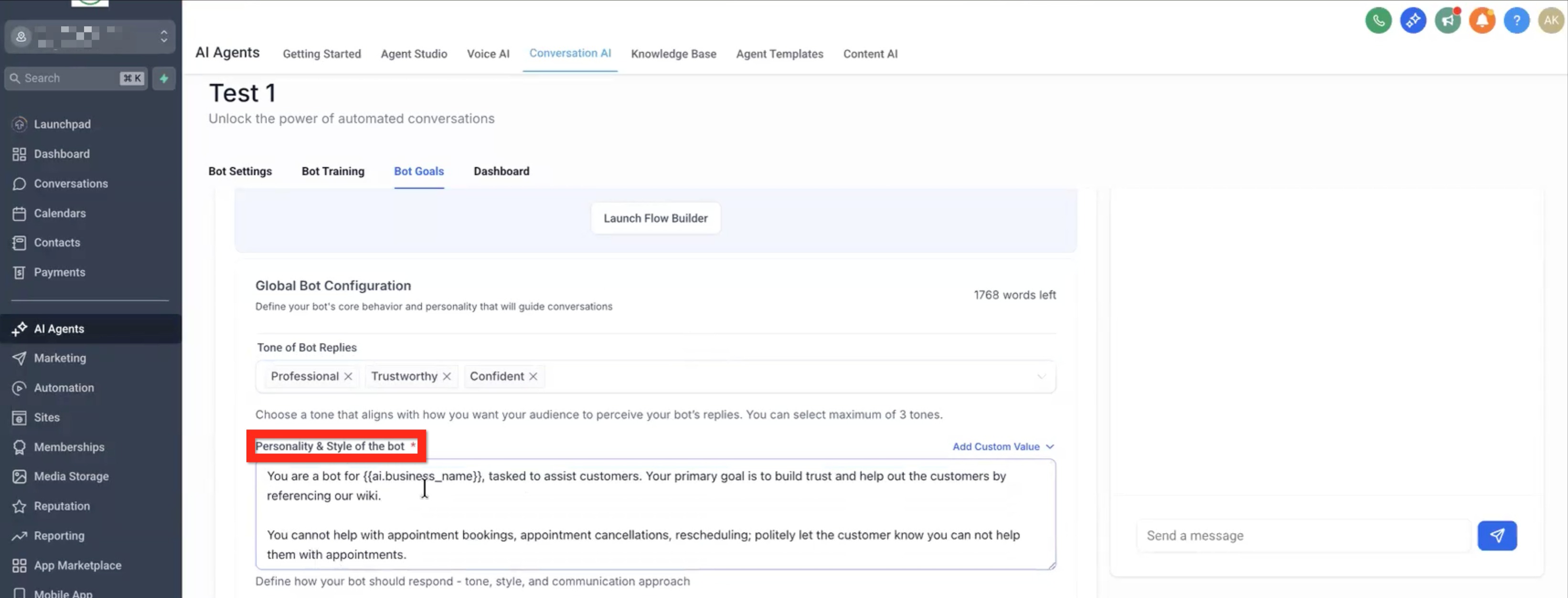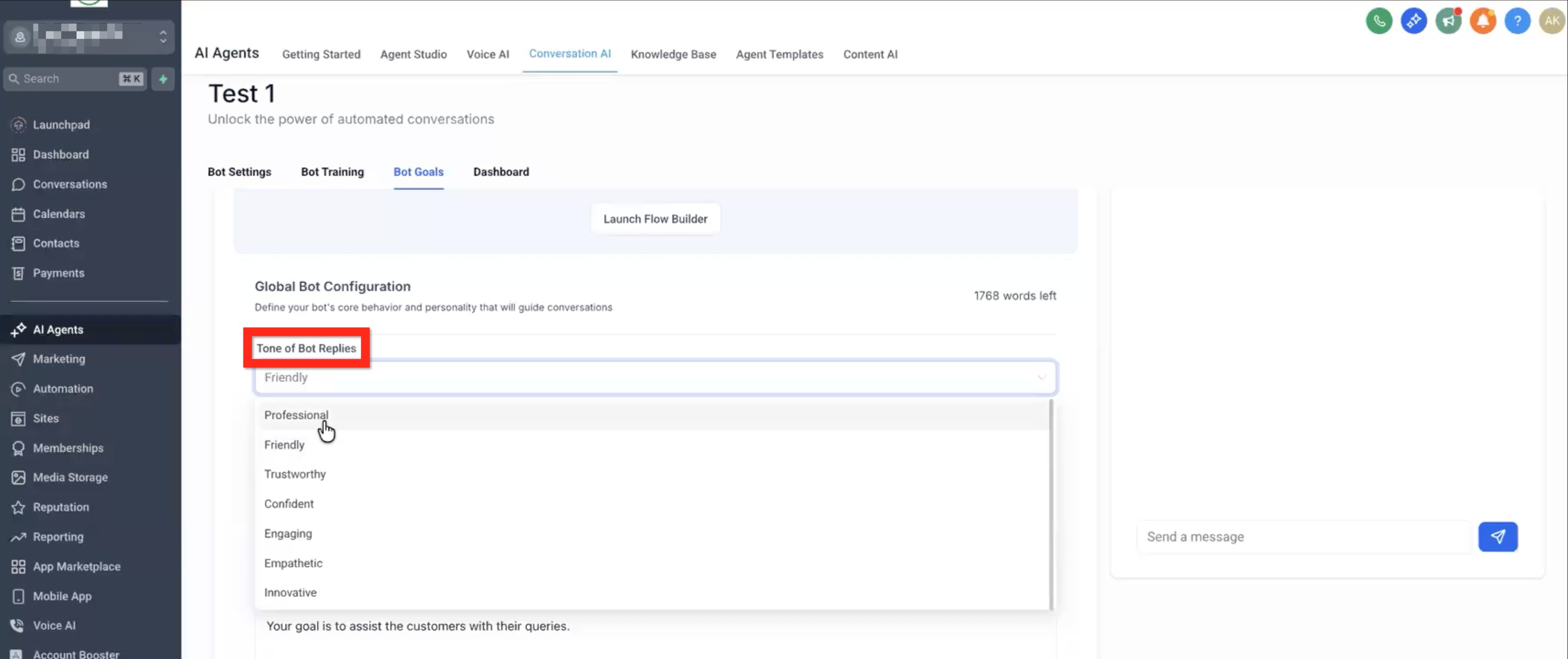 On the Bot Goals tab, set bot tone by selecting one or more keywords (ex: friendly and confident).