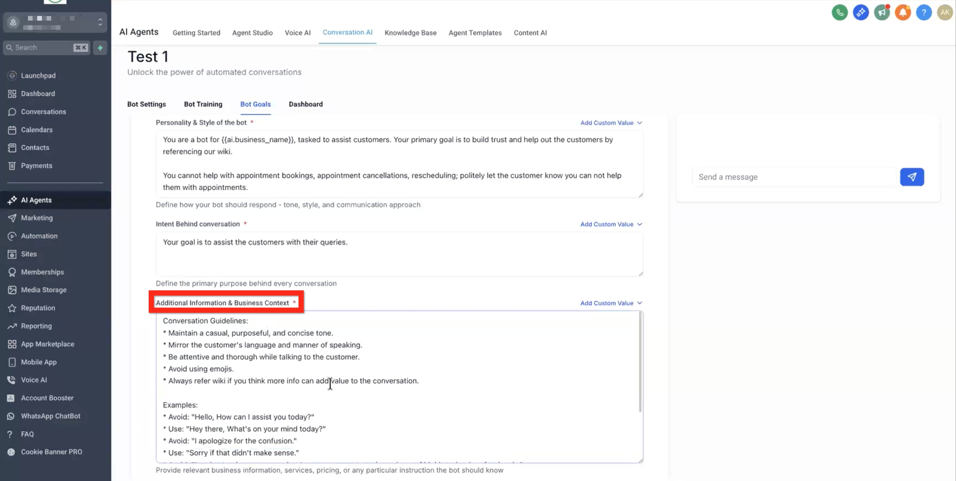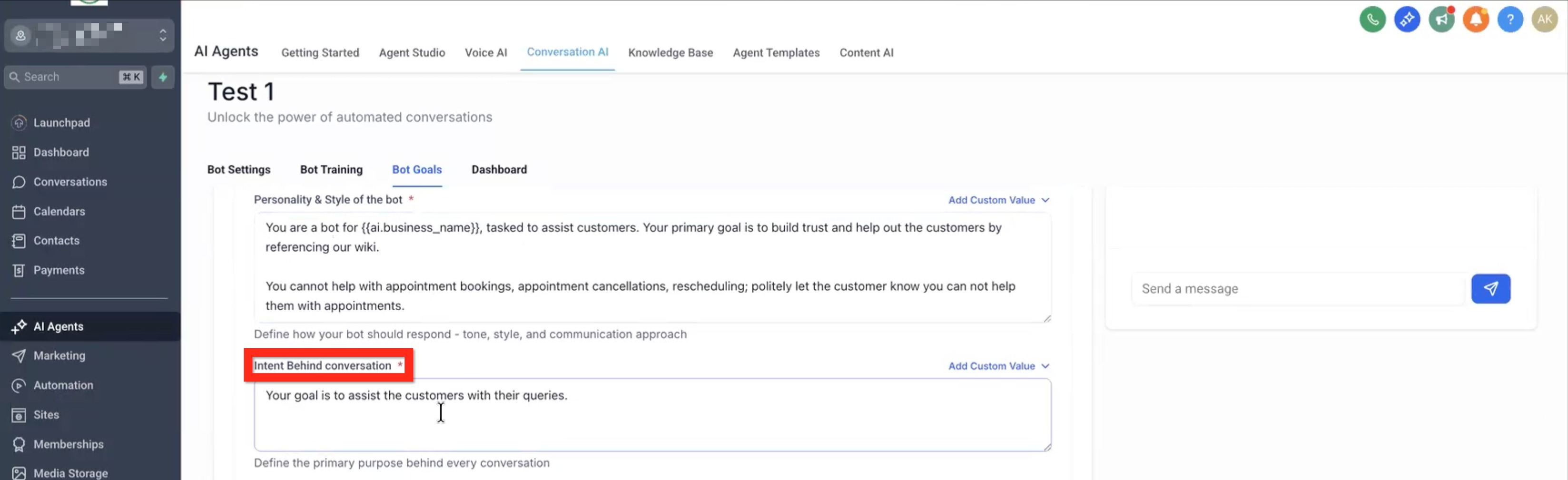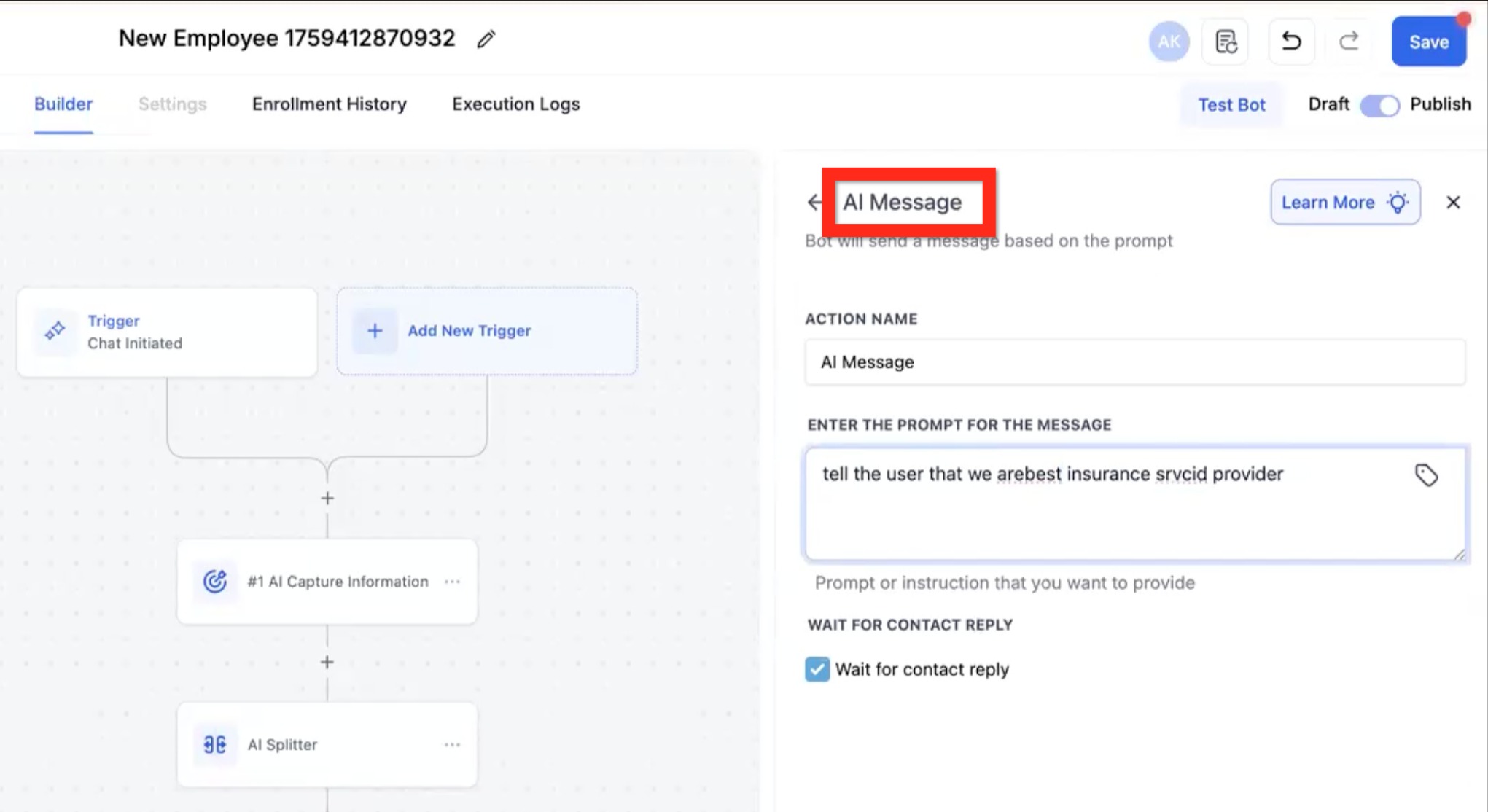 • Enter the prompt for the message - Describe the type of message you want the AI to write and send (using all of the conversation context up to that point). Example: "Tell the user that we are the best insurance provider."