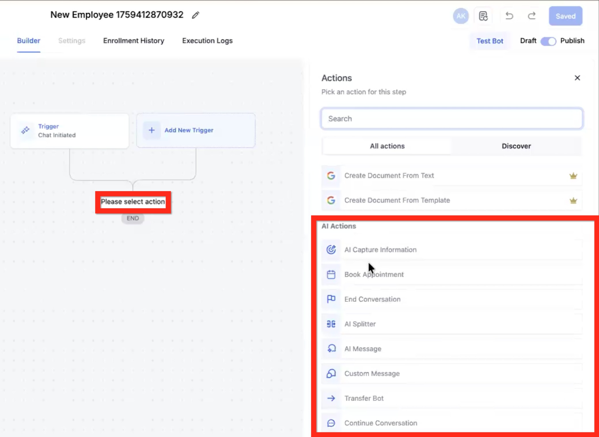 Click the plus (+) to select an action. The available actions are the same as in the Workflow Builder but also with new AI Actions. Scroll to the AI Actions section.