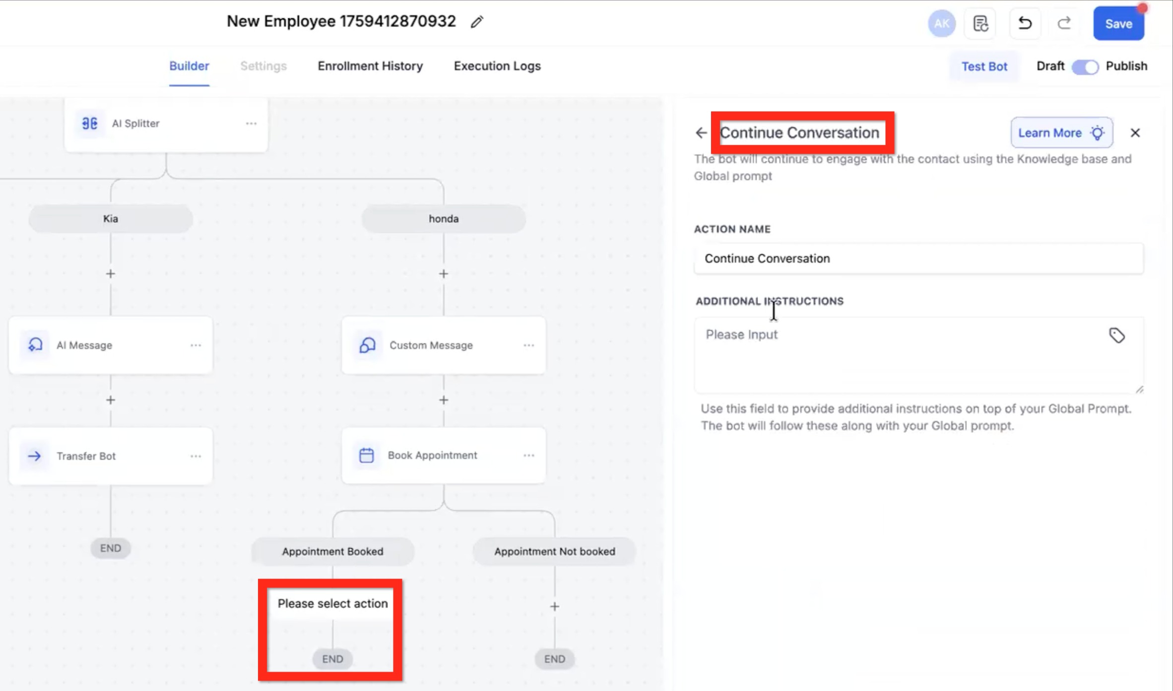 • NOTE: This action will loop attempting to meet its objective of booking an appointment using multiple messages unless there is a clear exit criteria such as "I don't want to book."