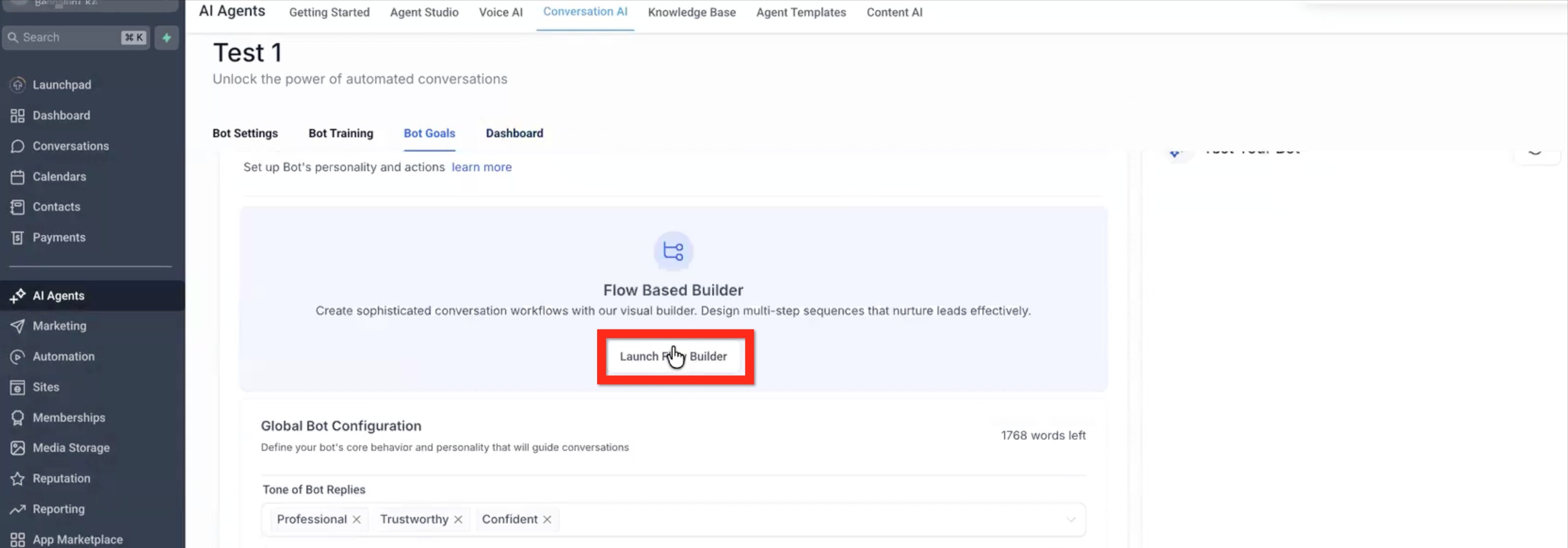 Navigate to bot Goals tab > Click the Launch Flow Builder button.